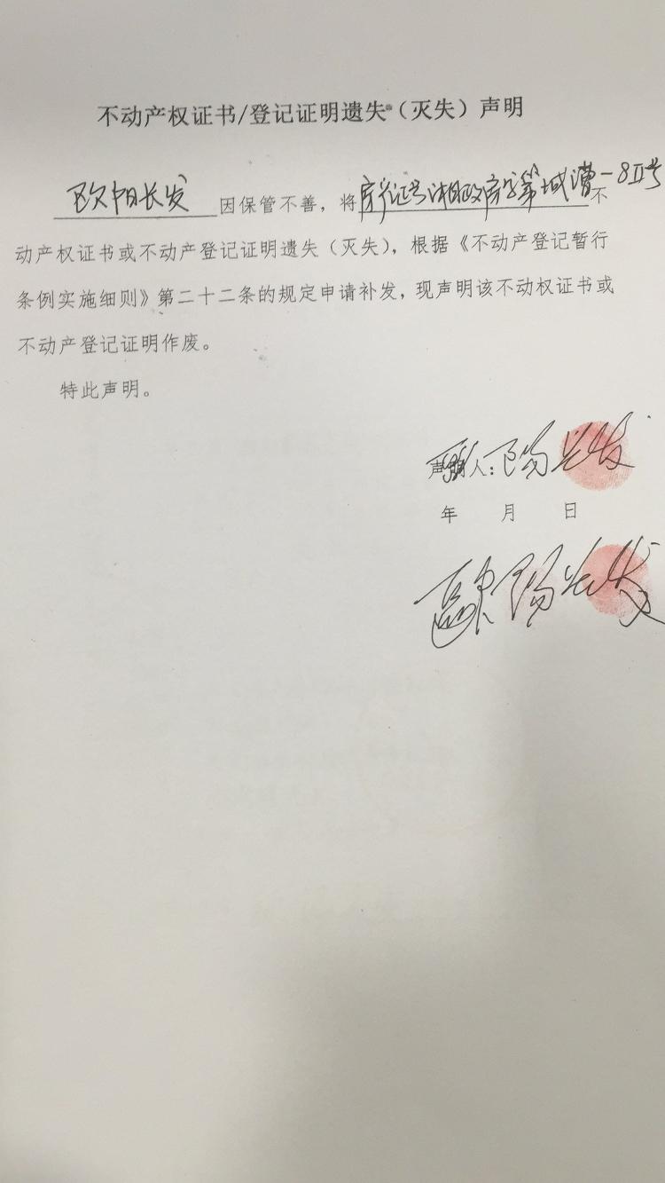 不动产权证书/登记证明遗失(灭失)声明|欧阳长发
