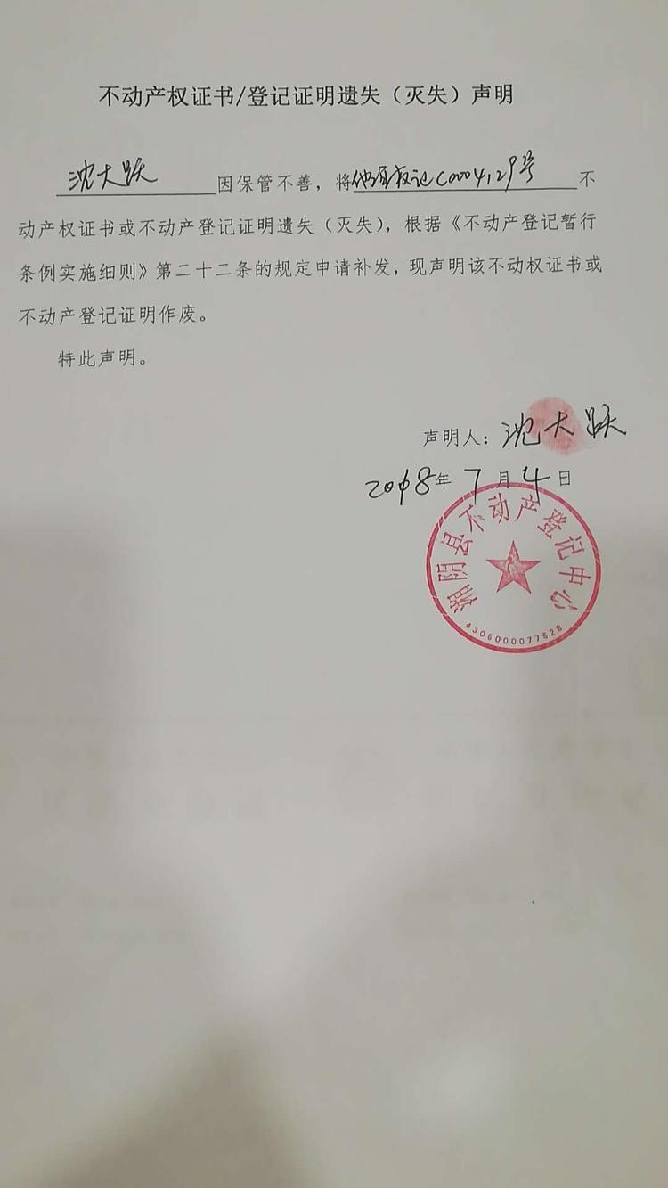 不动产权证书/登记证明遗失(灭失)声明|沈大跃