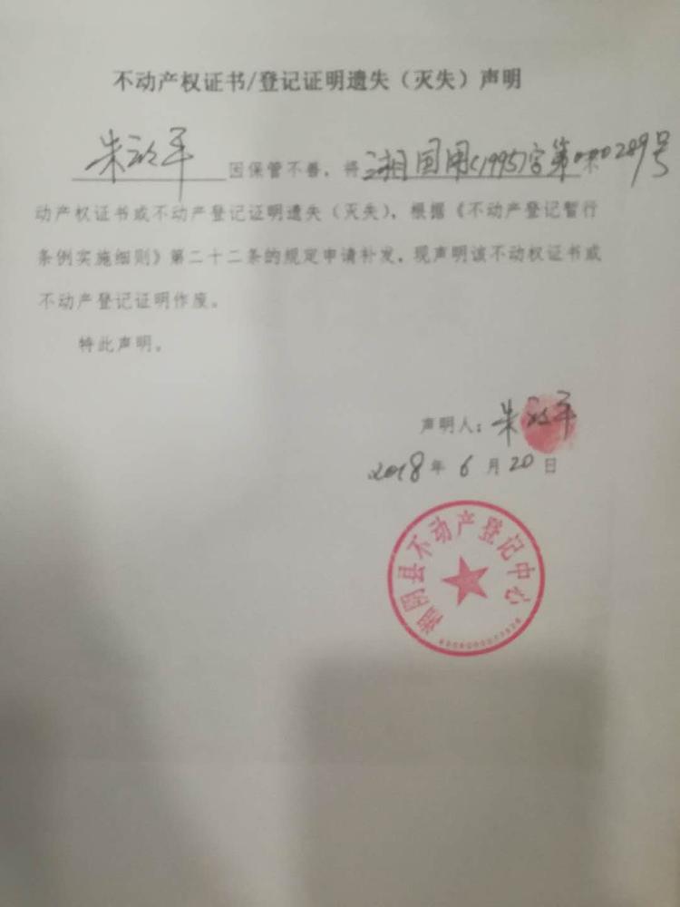 不动产权证书/登记证明遗失(灭失)声明|朱放平