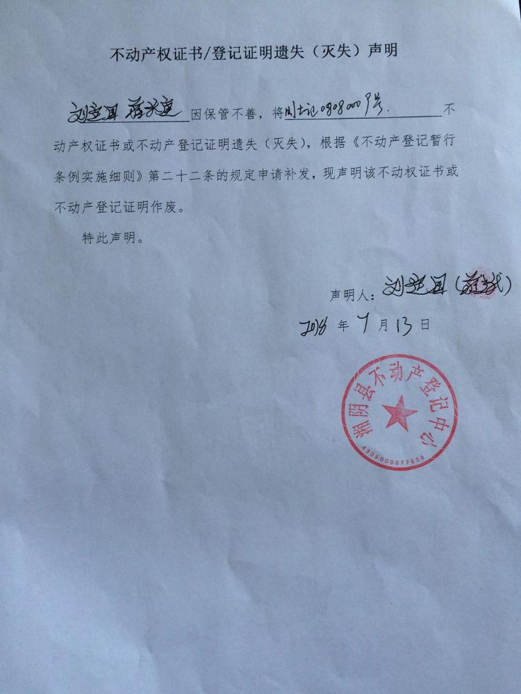 不动产权证书/登记证明遗失(灭失)声明|刘定国