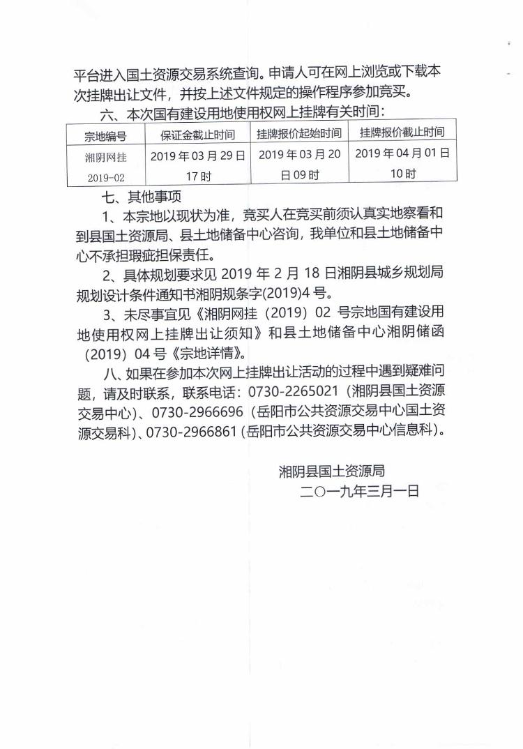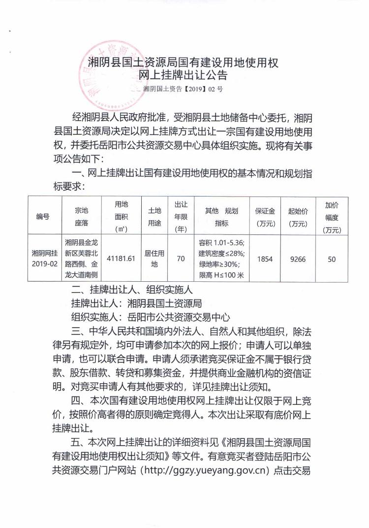 湘阴县国土资源局国有建设用地使用权网上挂牌出让公告(湘阴国土资告【2019】02号)