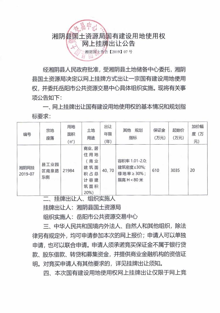 湘阴县国土资源局国有建设用地使用权网上挂牌出让公告(湘阴国土资告【2019】07号)