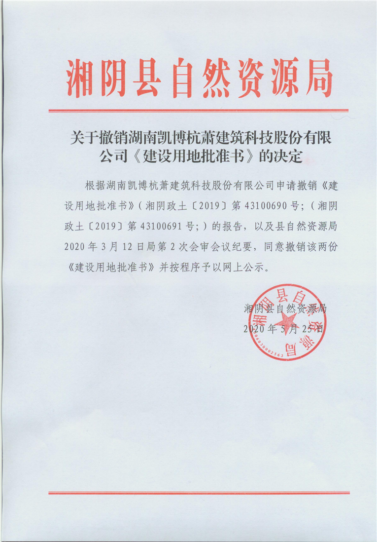 关于撤销湖南凯博杭萧建筑科技股份有限公司《建设用地批准书》的决定