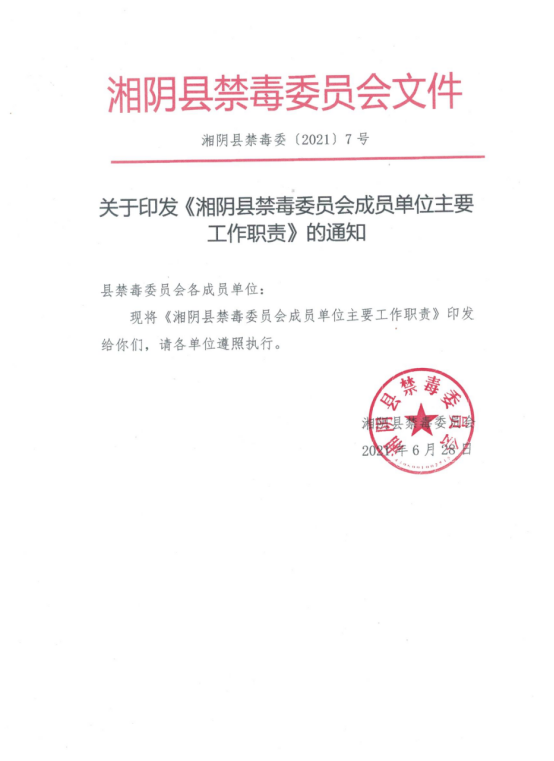 为切实加强对全县禁毒工作的领导,组织、协调有关部门、单位并动员全社会的力量开展禁毒斗争,充分发挥县禁毒委员会成员单位的职能作用,各司其职、各负其责、协作配合,按照国家、省、市禁毒委的要求,结合我县实际,现将县禁毒委员会成员单位在禁毒工作中的主要职责明确如下: