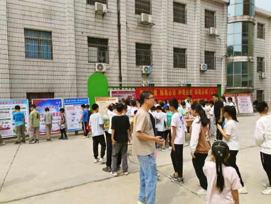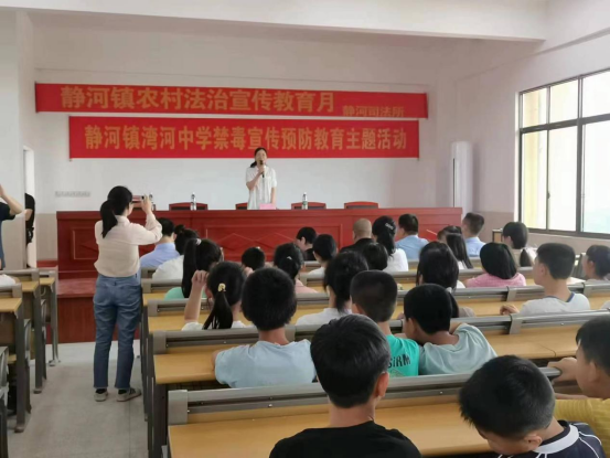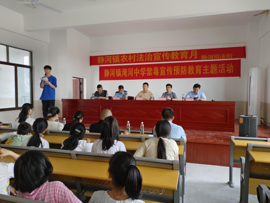 2023年6月1日星期四静河镇禁毒办、禁毒分会联合县禁毒联点单位自然资源局、应急管理局、邀请司法局社戒社康管理股在湾河中学开展禁毒法治进校园及“三防”知识专题宣讲活动。