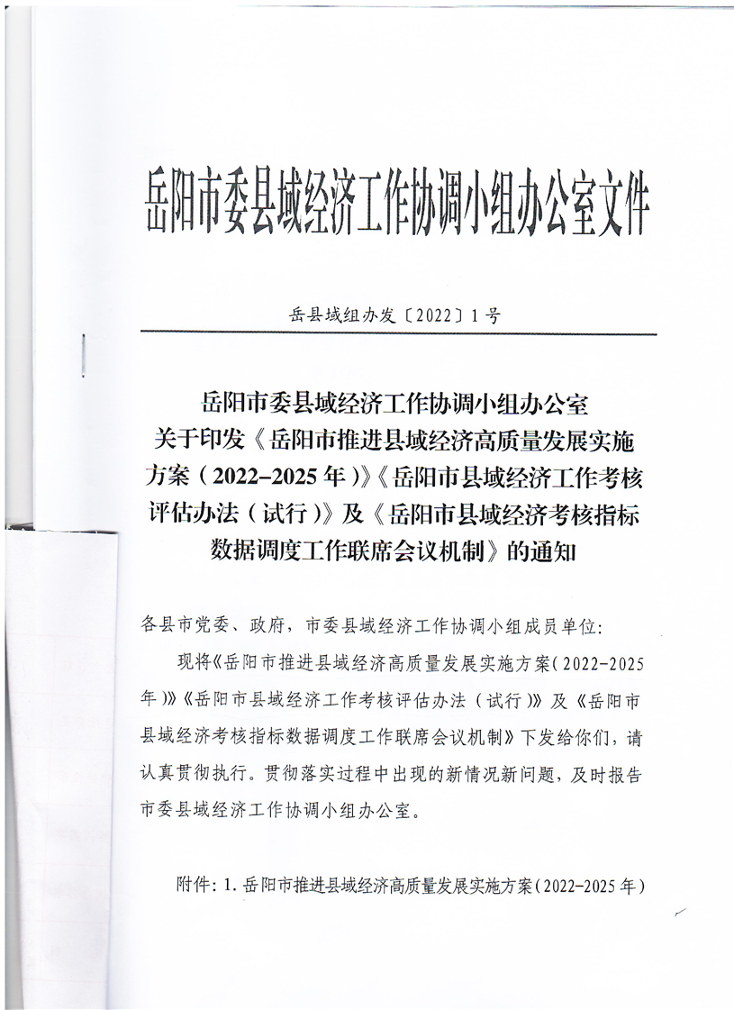 岳阳市委县域经济工作协调小组办公室关于印发《岳阳市推进县域经济高质量发展实施方案(2022-2025年)》《岳阳市县域经济工作考核评估办发(试行)》及《岳阳市县域经济考核指标数据调度工作联席会议机制》的通知