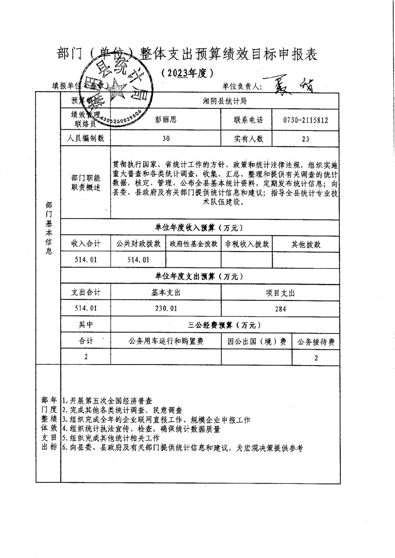 2023年度湘阴县统计局整体支出预算绩效目标申报表