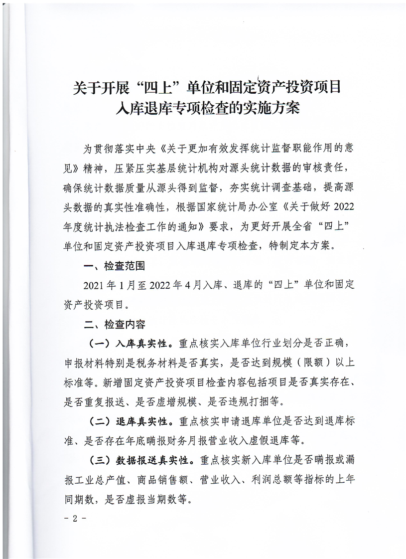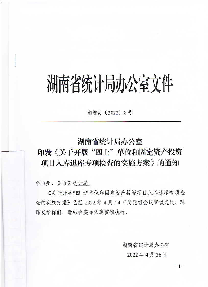 湖南省统计局办公室印发《关于开展“四上”单位和固定资产投资项目入库退库专项检查的实施方案》的通知
