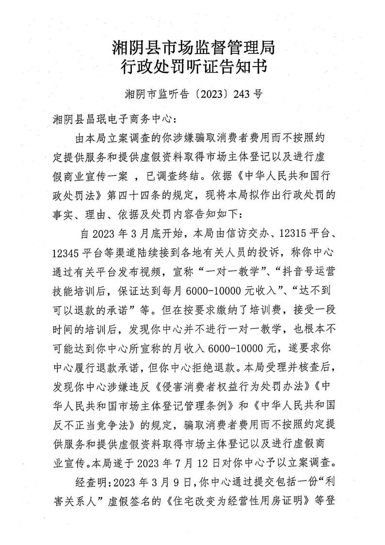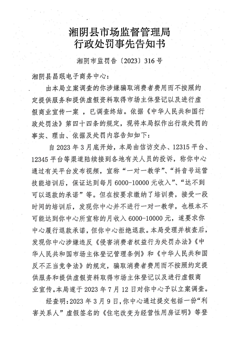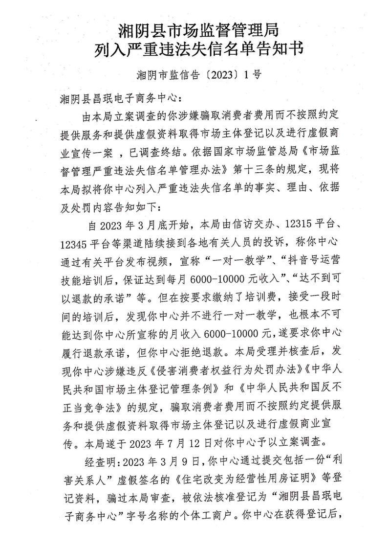 湘阴县市场监督管理局关于湘阴县昌珉电子商务中心骗取消费者费用而不按照约定提供服务和提供虚假资料取得市场主体登记以及进行虚假商业宣传的行政处罚事先告知书、行政处罚听证告知书、列入严重违法失信名单告知书