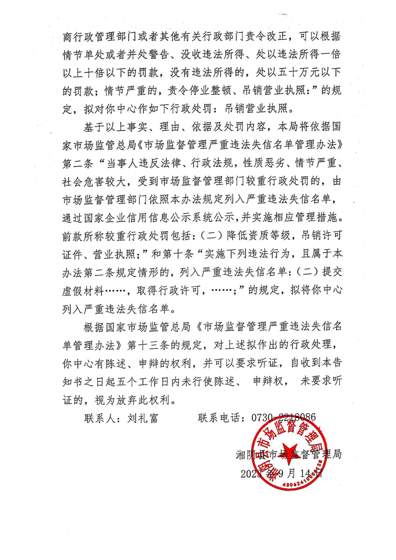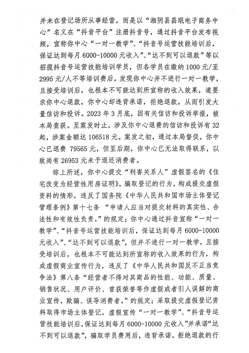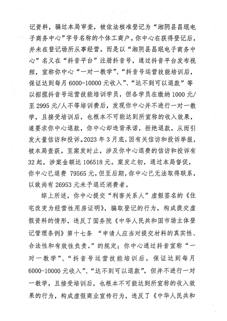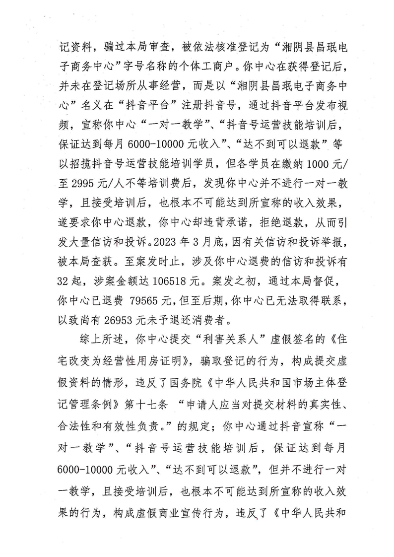 湘阴县市场监督管理局关于湘阴县昌珉电子商务中心骗取消费者费用而不按照约定提供服务和提供虚假资料取得市场主体登记以及进行虚假商业宣传的行政处罚事先告知书、行政处罚听证告知书、列入严重违法失信名单告知书