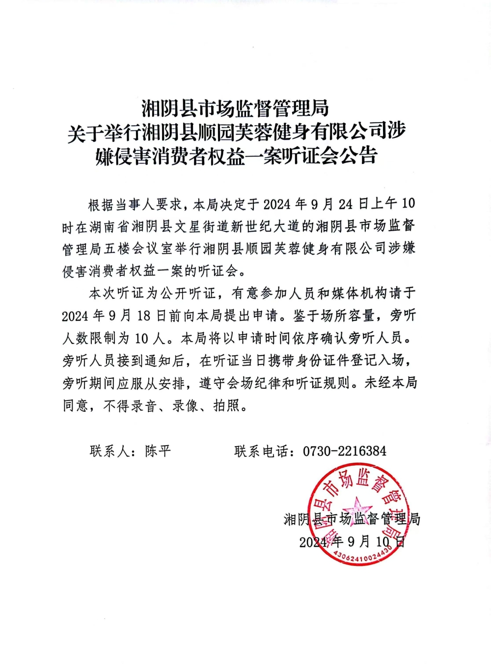 湘阴县市场监督管理局关于举行湘阴县顺园芙蓉健身有限公司涉嫌侵害消费者权益一案听证会公告