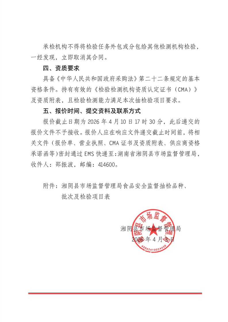 湘阴县市场监督管理局2026年度食品监督抽检询价方案