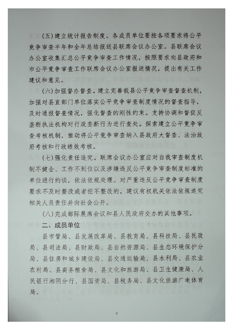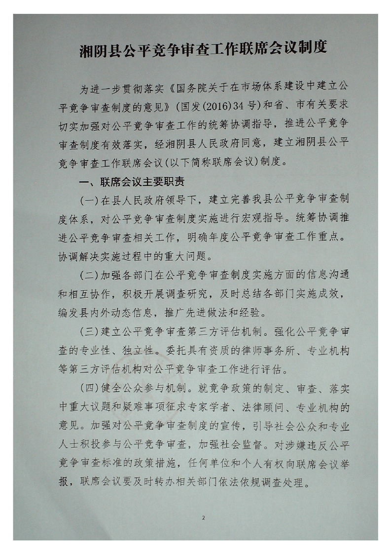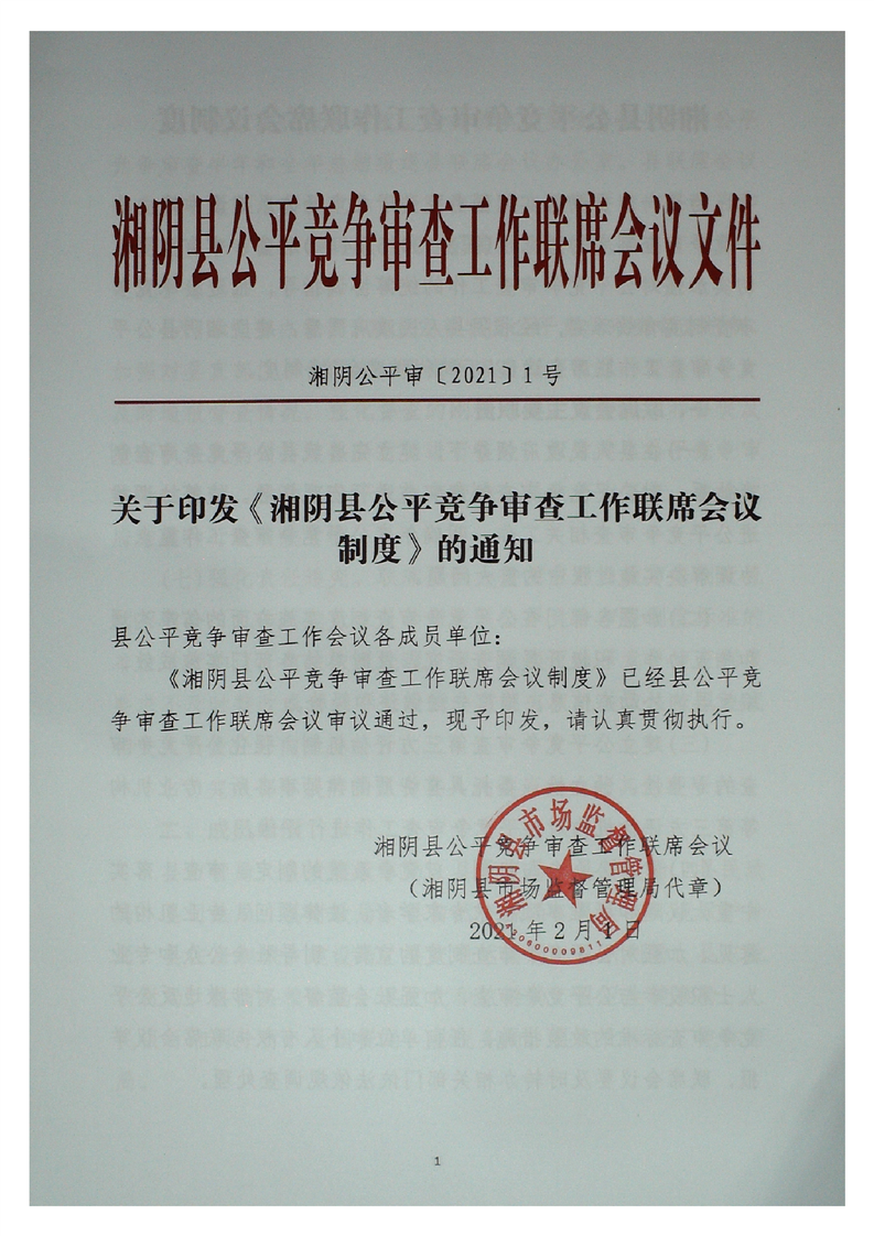 关于印发《湘阴县公平竞争审查工作联席会议制度》的通知