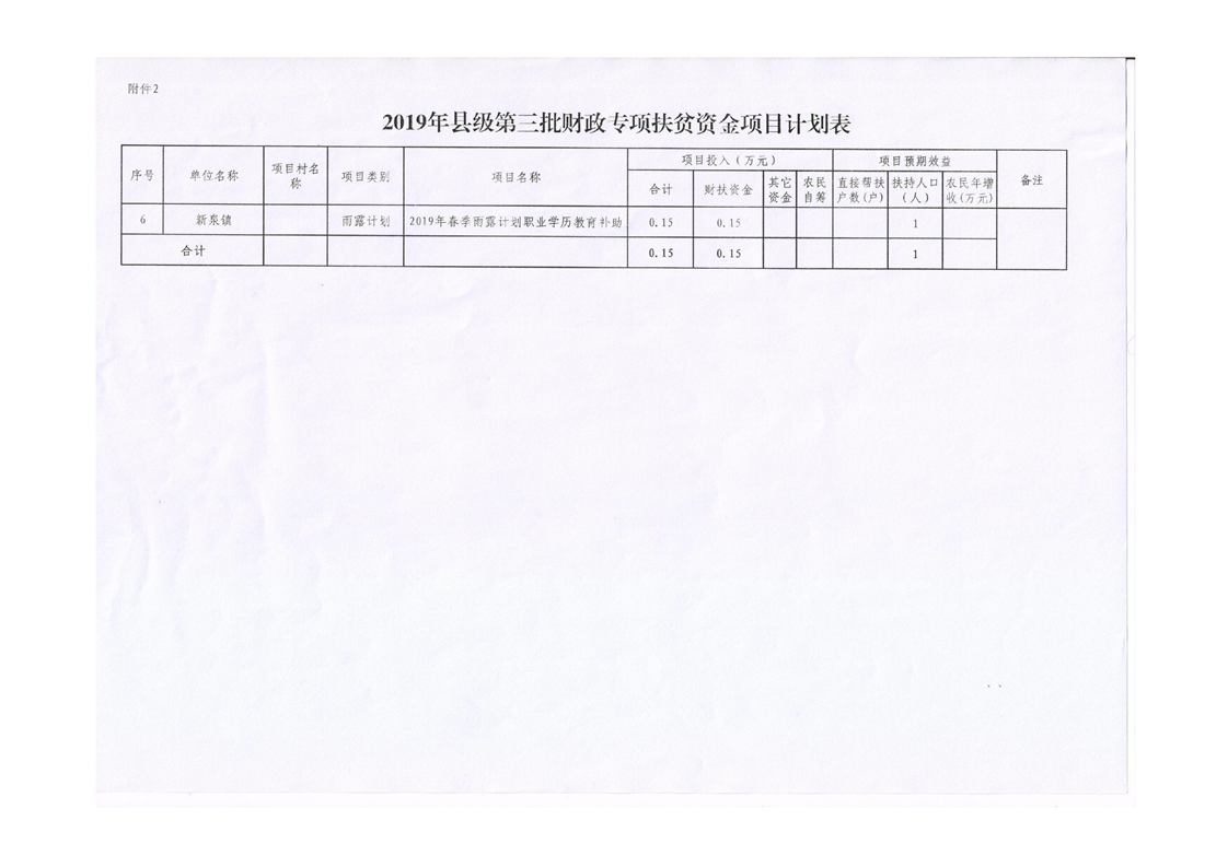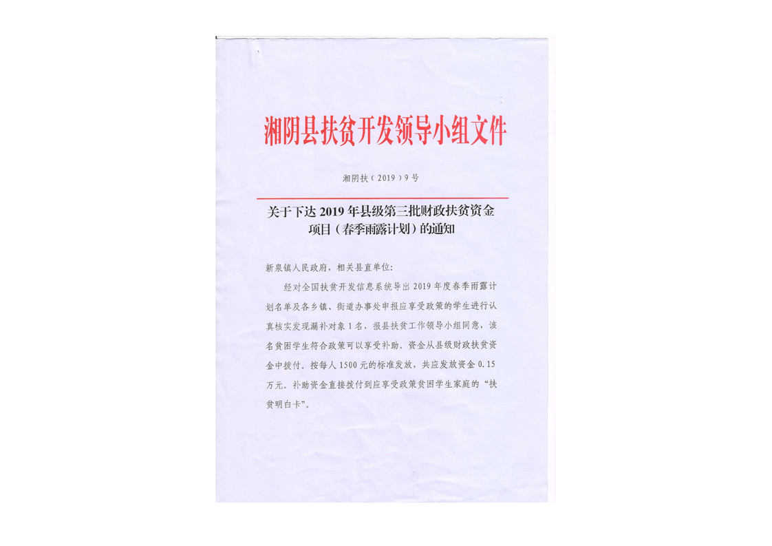 9号关于下达2019年县级第三批财政专项扶贫资金项目(春季雨露计划)的通知