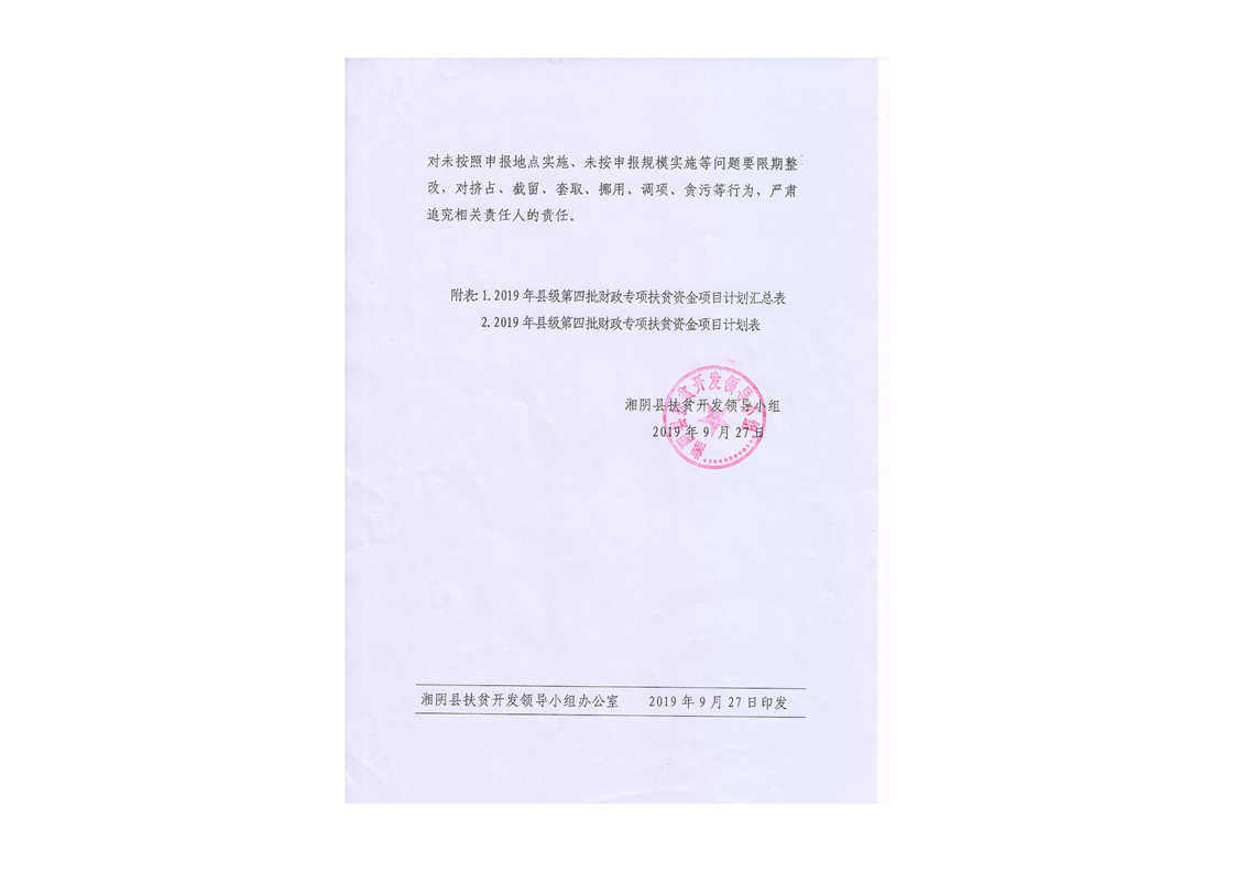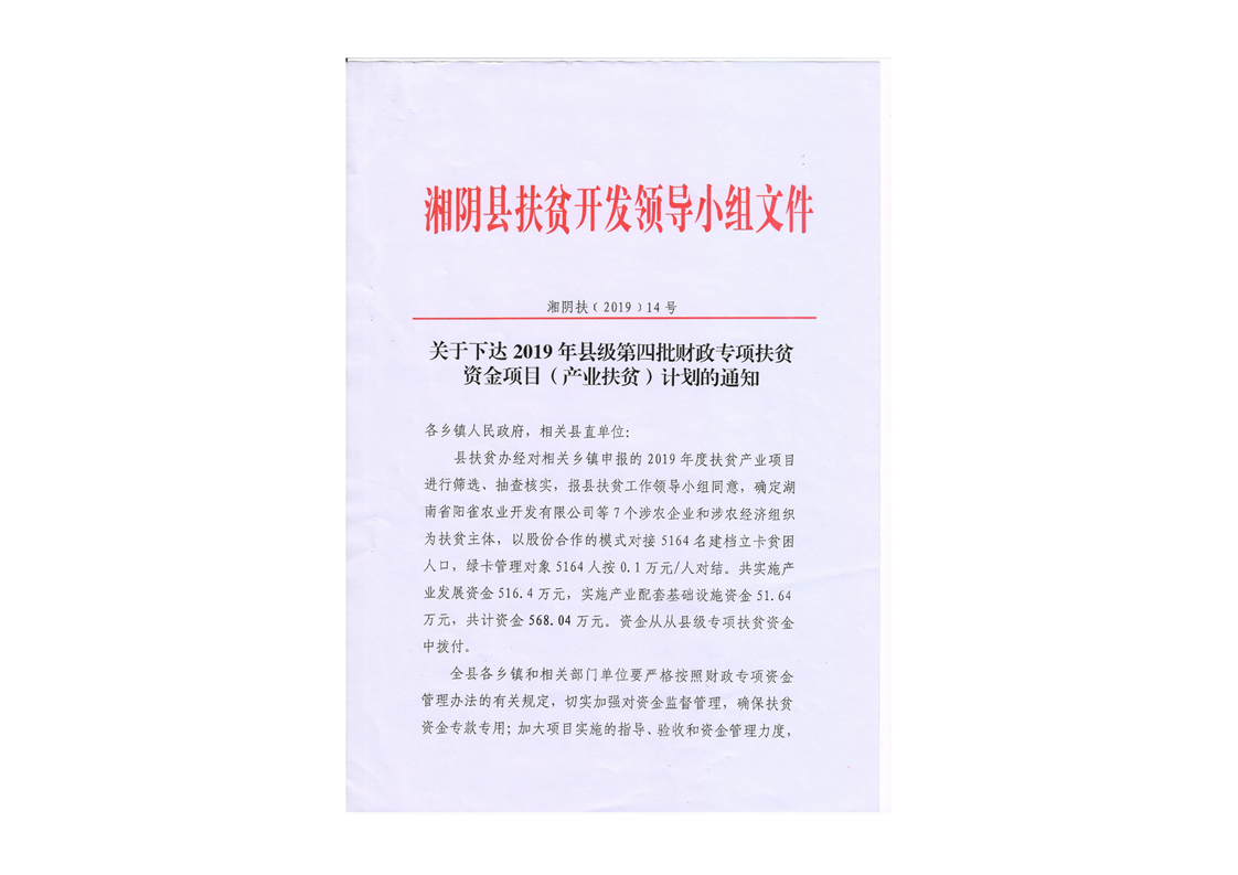 14号关于下达2019年县级第四批财政专项扶贫资金项目(产业扶贫)计划的通知