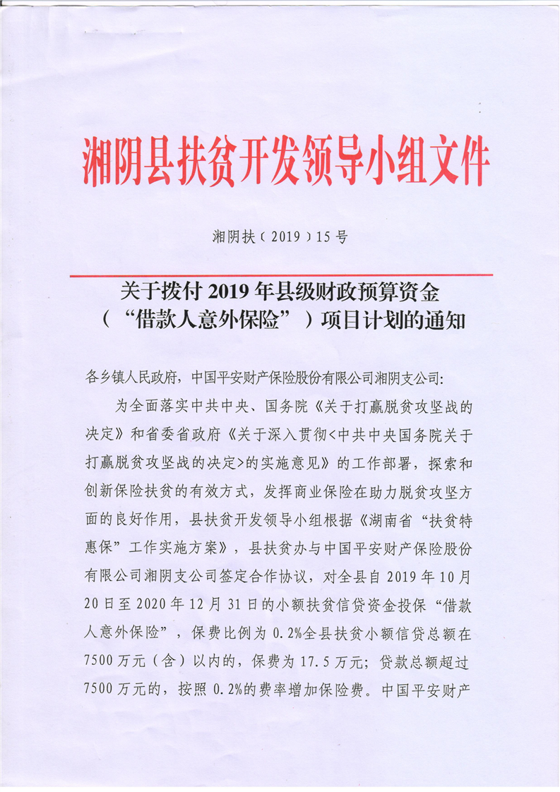 15号关于拨付2019年县级财政预算资金(借款人意外保险)项目计划的通知