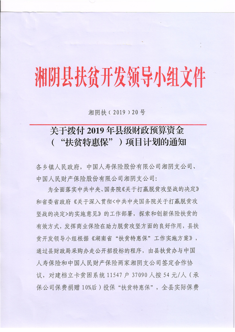 20号关于拨付2019年县级财政预算资金(扶贫特惠保)项目计划的通知