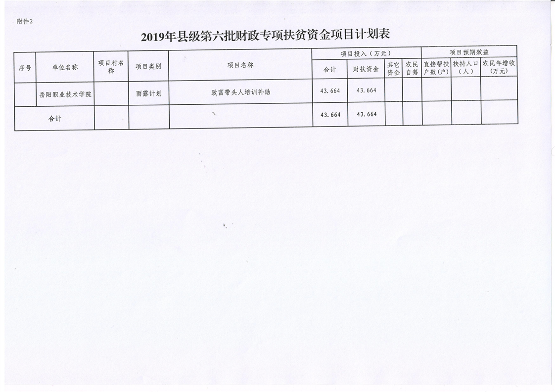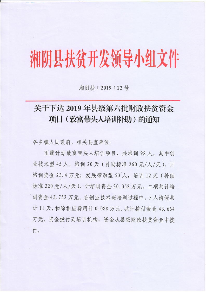 关于下达2019年县级第六批财政扶贫资金项目(致富带头人培训补助)的通知