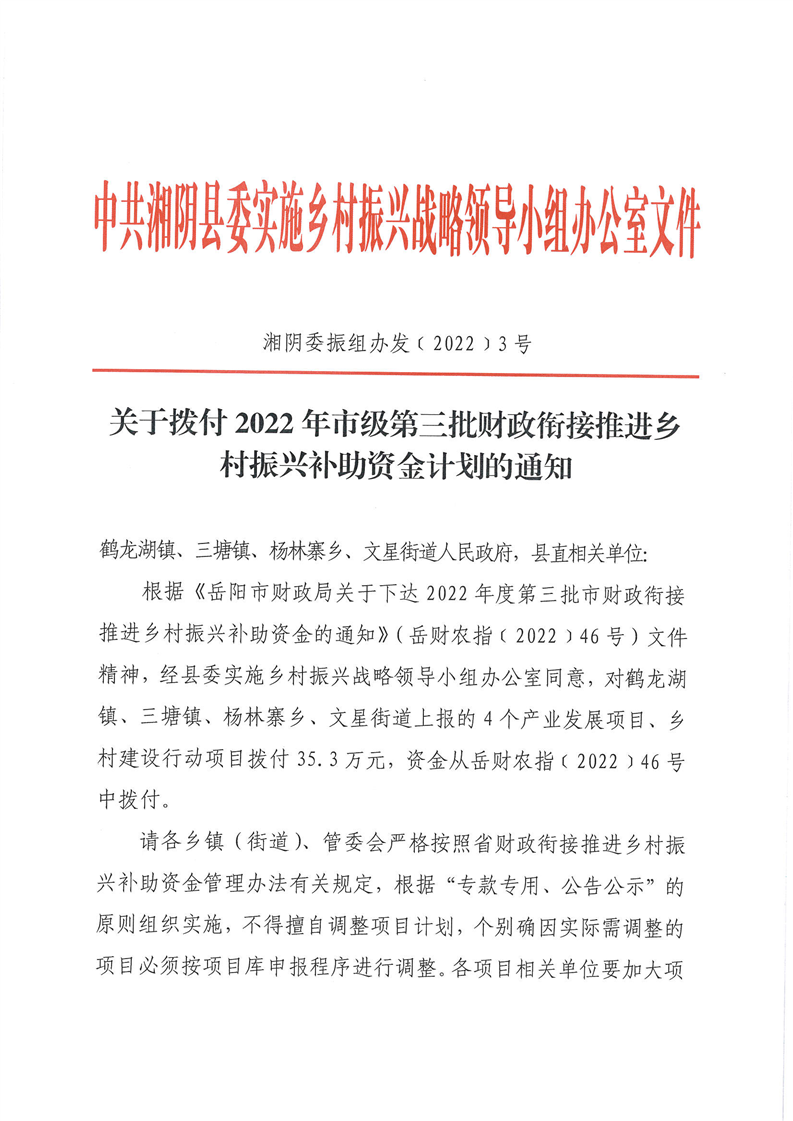 关于拨付2022年市级第三批财政衔接推进乡村振兴补助资金计划的通知