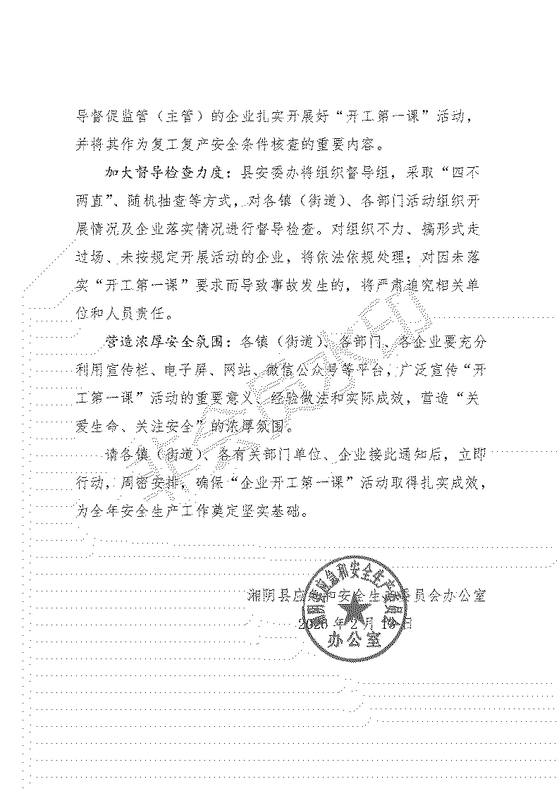 湘阴县应急和安全生产委员会办公室 关于组织开展2026年“企业开工第一课”讲安全活动的通知