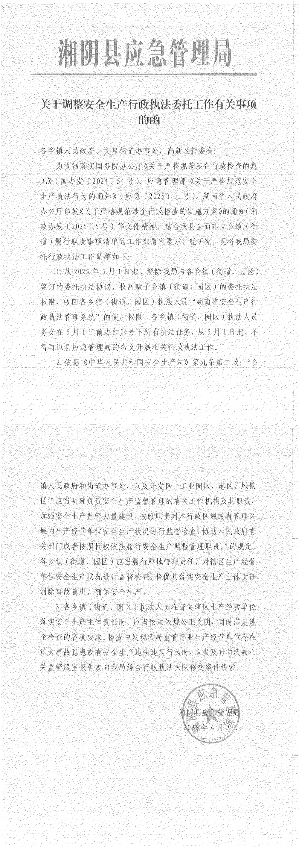 关于调整安全生产行政执法委托工作有关事项的函
