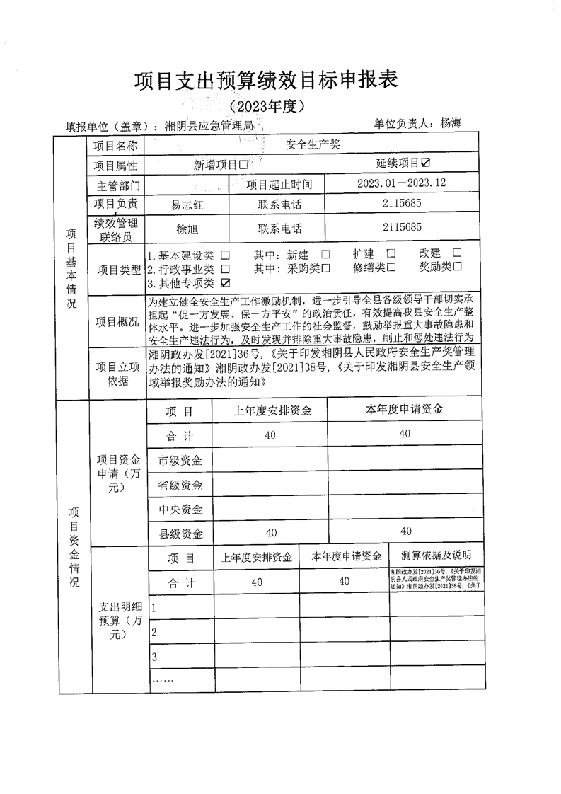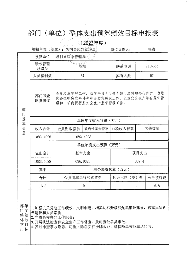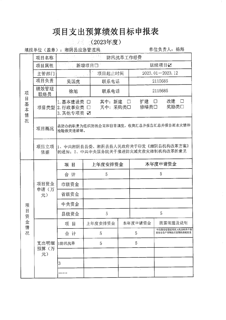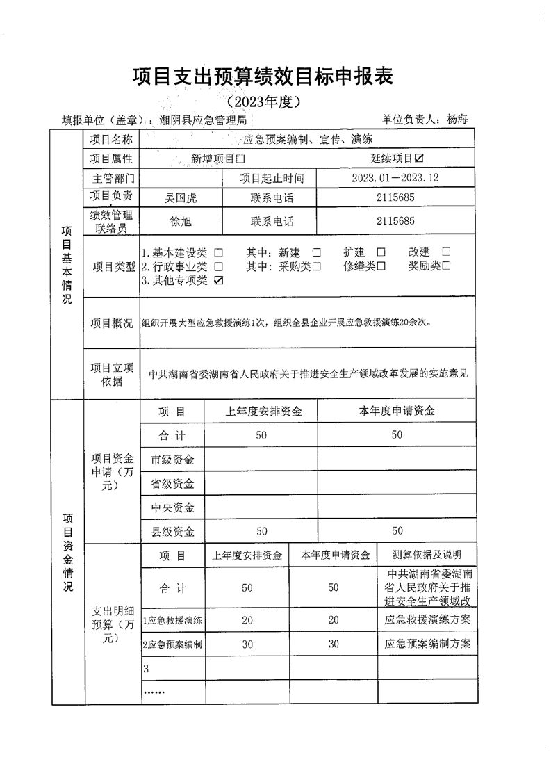2023年度-湘阴县应急管理局-整体和项目支出预算绩效目标申报表