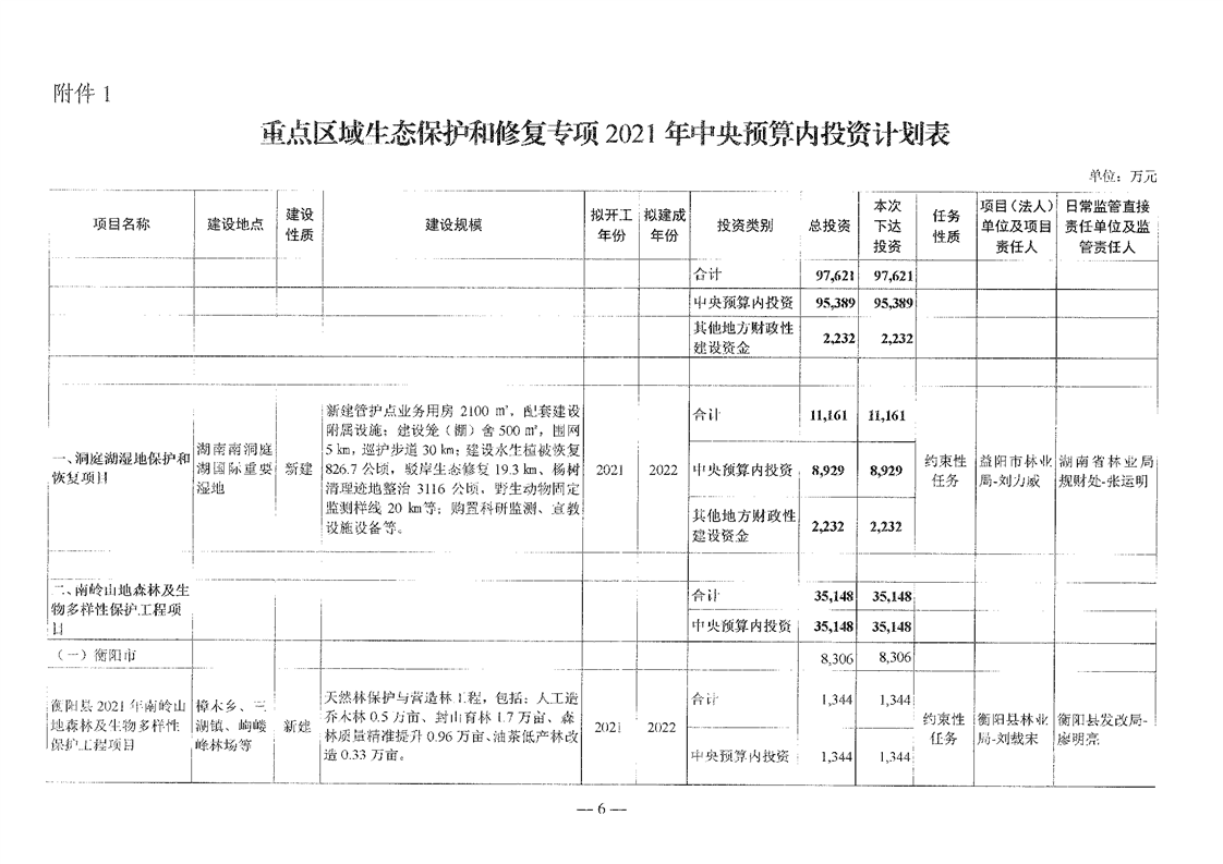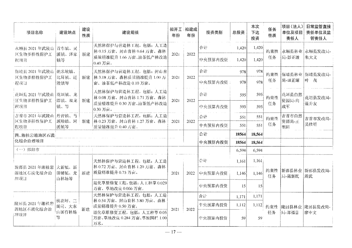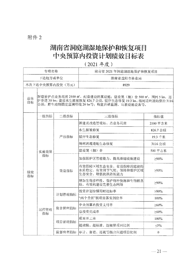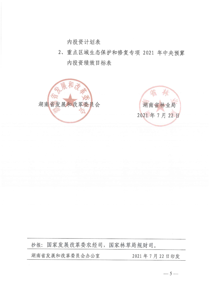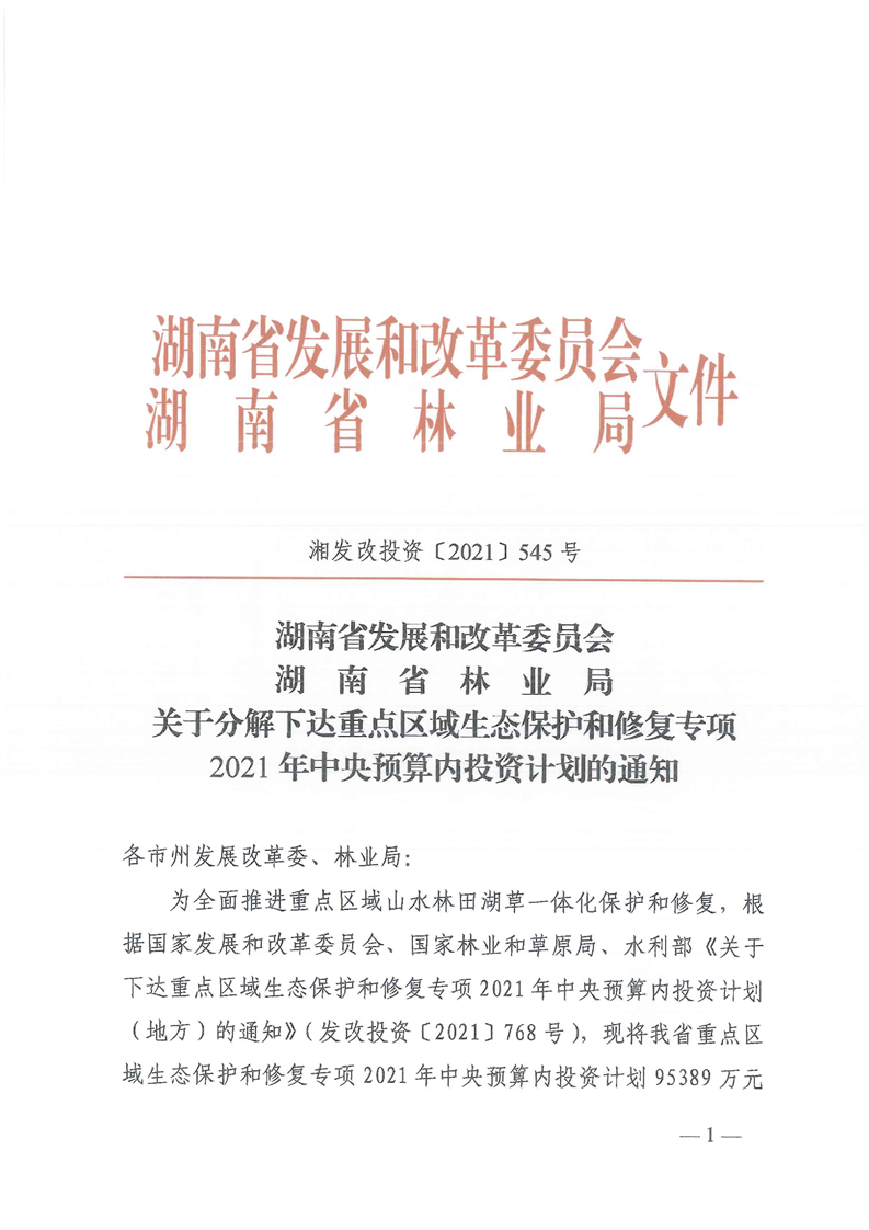 关于分解下达重点区域生态保护和修复专项2021年中央预算内投资计划的通知(湘发改投资[2021]545号)