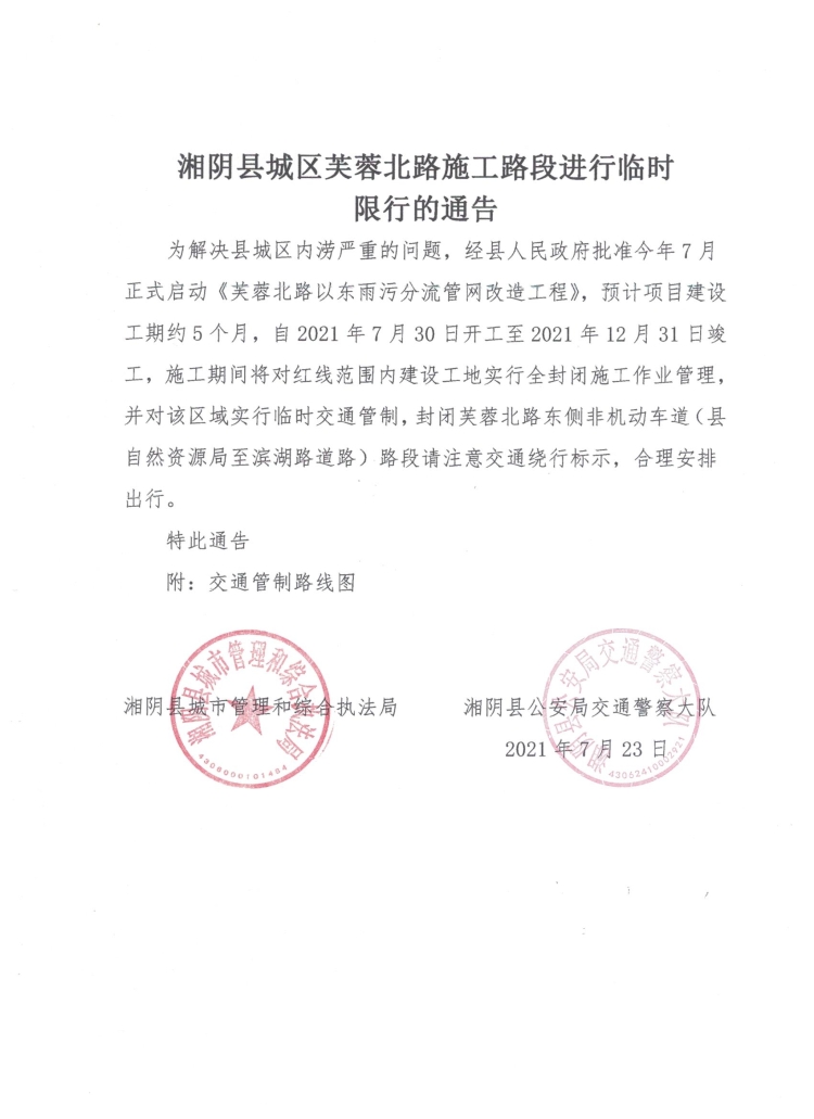 湘阴县城区芙蓉北路施工路段进行临时限行的通告