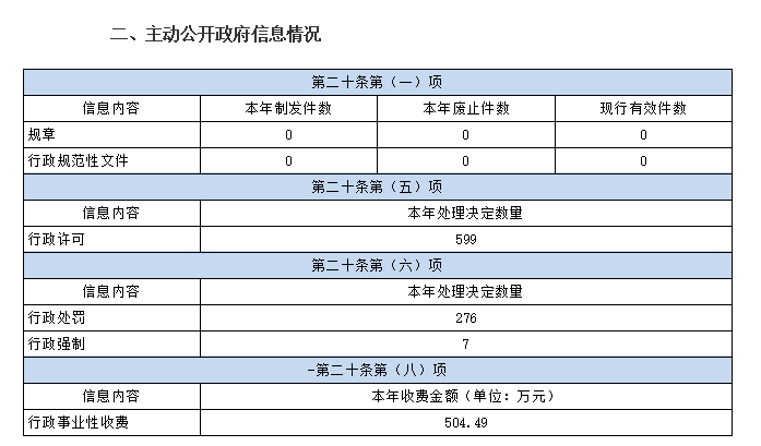 2021年,湘阴县城市管理和综合执法局在县委、县政府的正确领导和精心指导下,认真贯彻执行《中华人民共和国政府信息公开条例》,落实好上级相关文件要求,确保政府信息全面、及时、准确公开,提高工作的透明度和公信力,在经济社会活动和人民群众生产、生活提供服务方面,取得了较好成效。2021年,我局按照政府信息主动公开范围,通过县政府网站发布工作动态17条,部门概况1条,部门文件2条,规划计划3条,人事信息1条,资金信息2条,信息公开指南1条,信息公开年度报告1条,通知公告6条。同时,在机构信息中及时公开了本单位领导班子成员情况和工作分工情况,对本单位的职能部门及其主要职能进行了详细介绍。