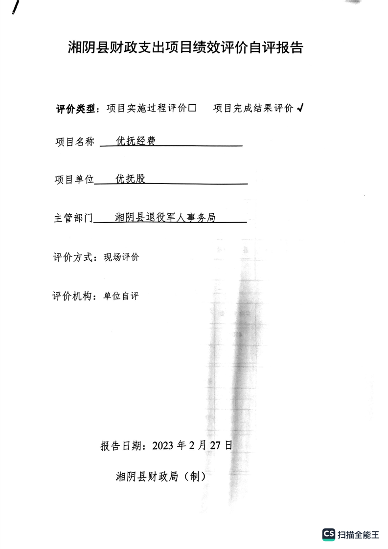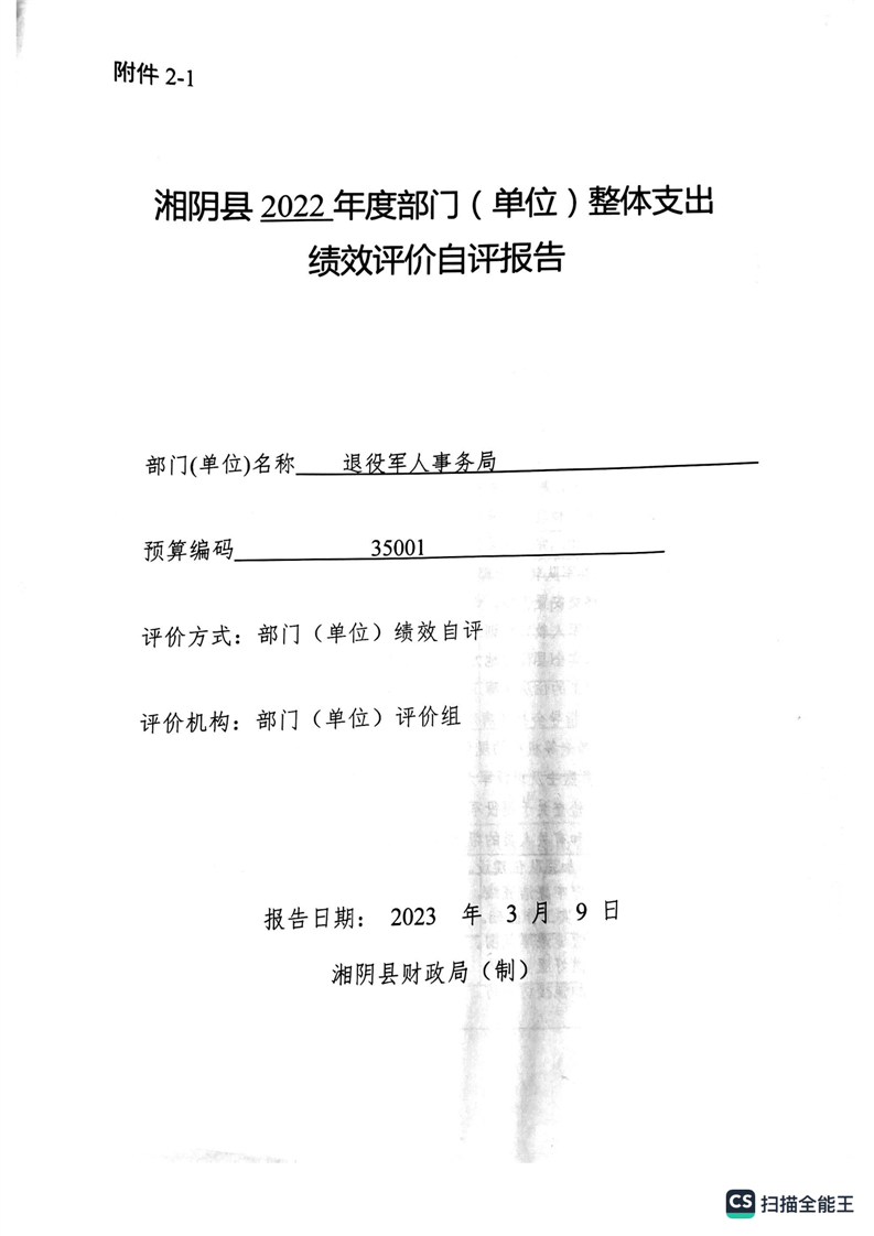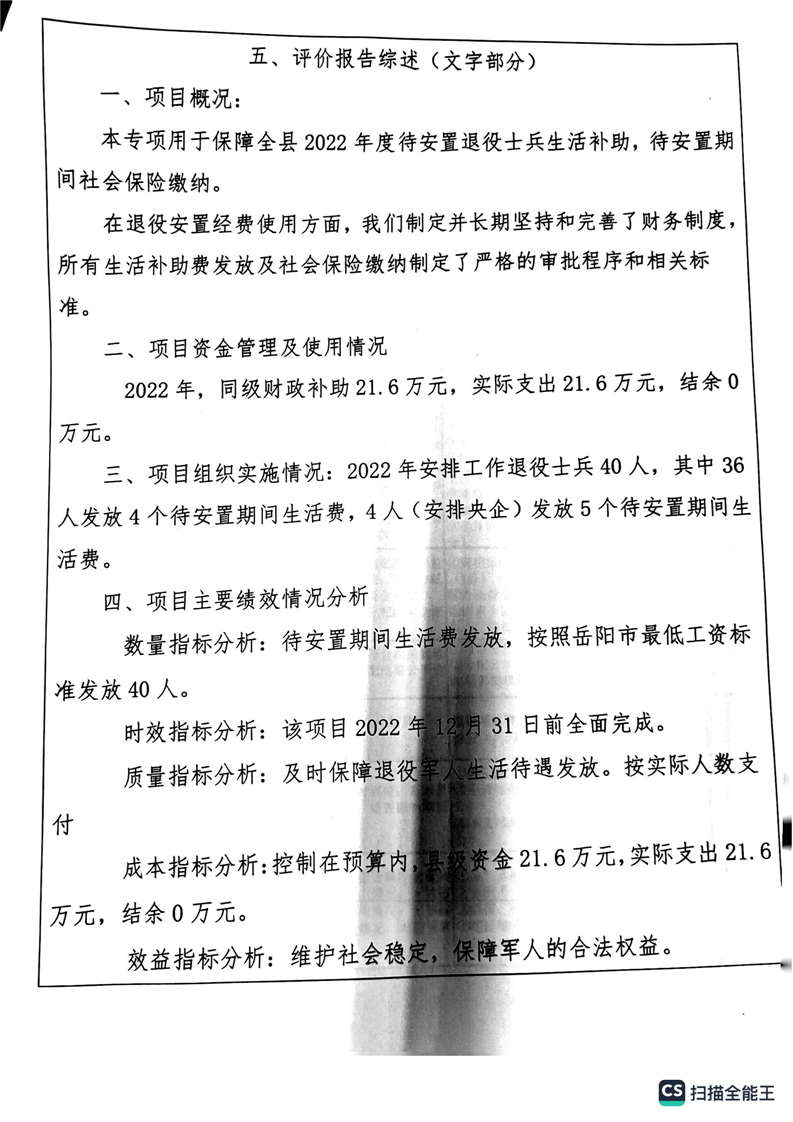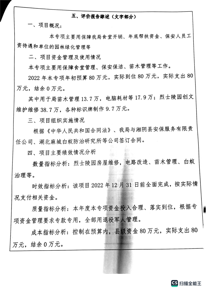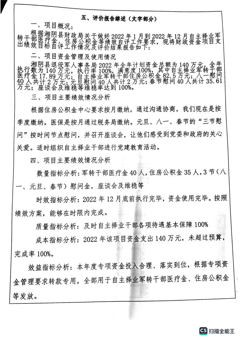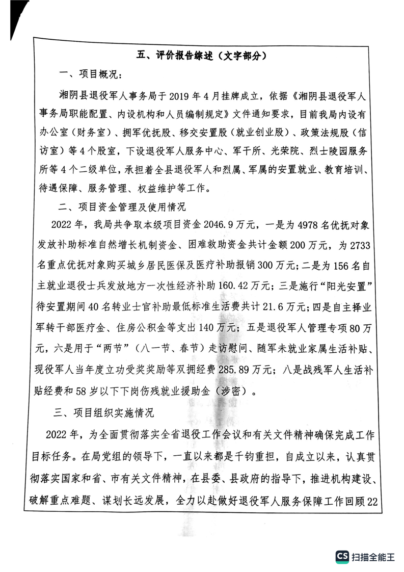 湘阴县退役军人事务局2022年度整体支出绩效自评报告