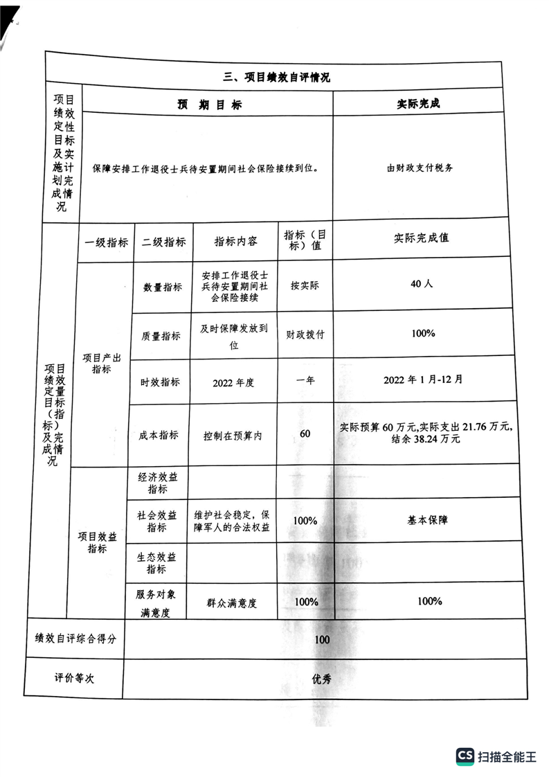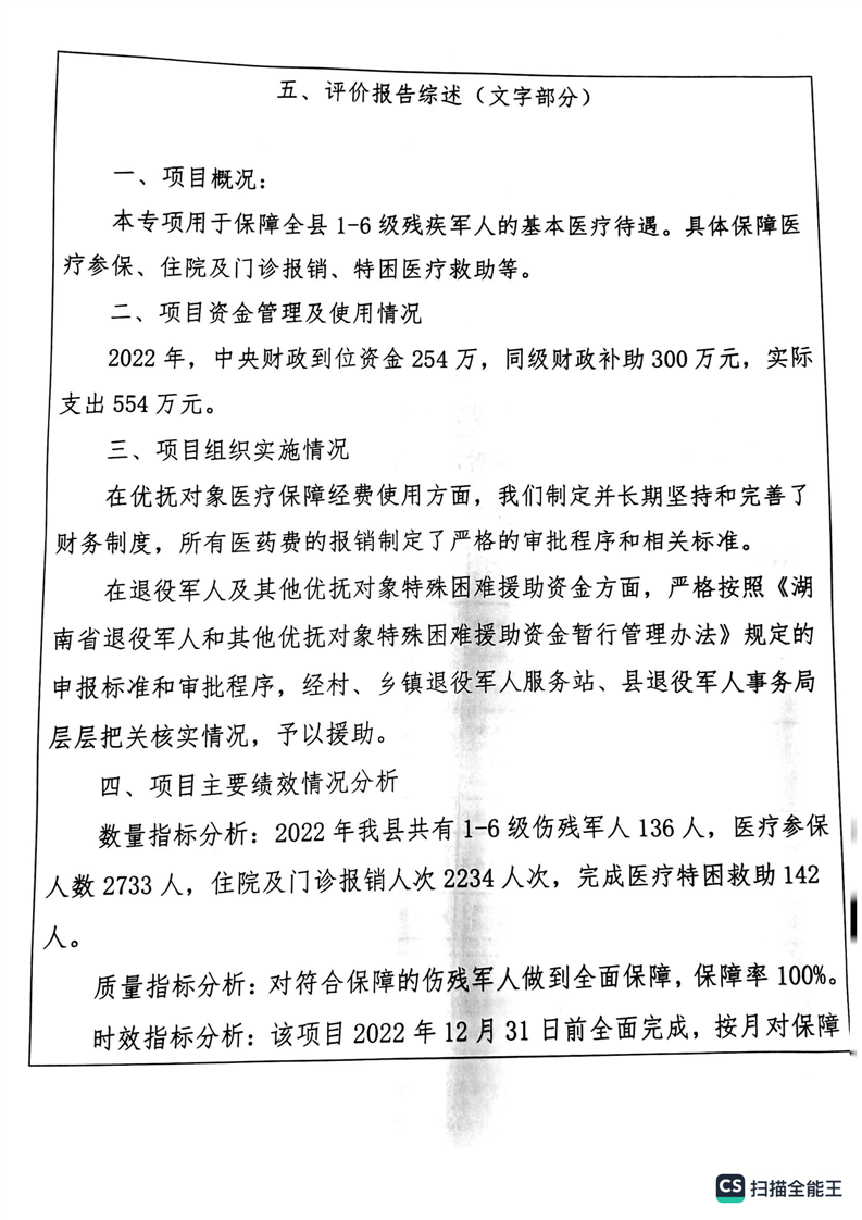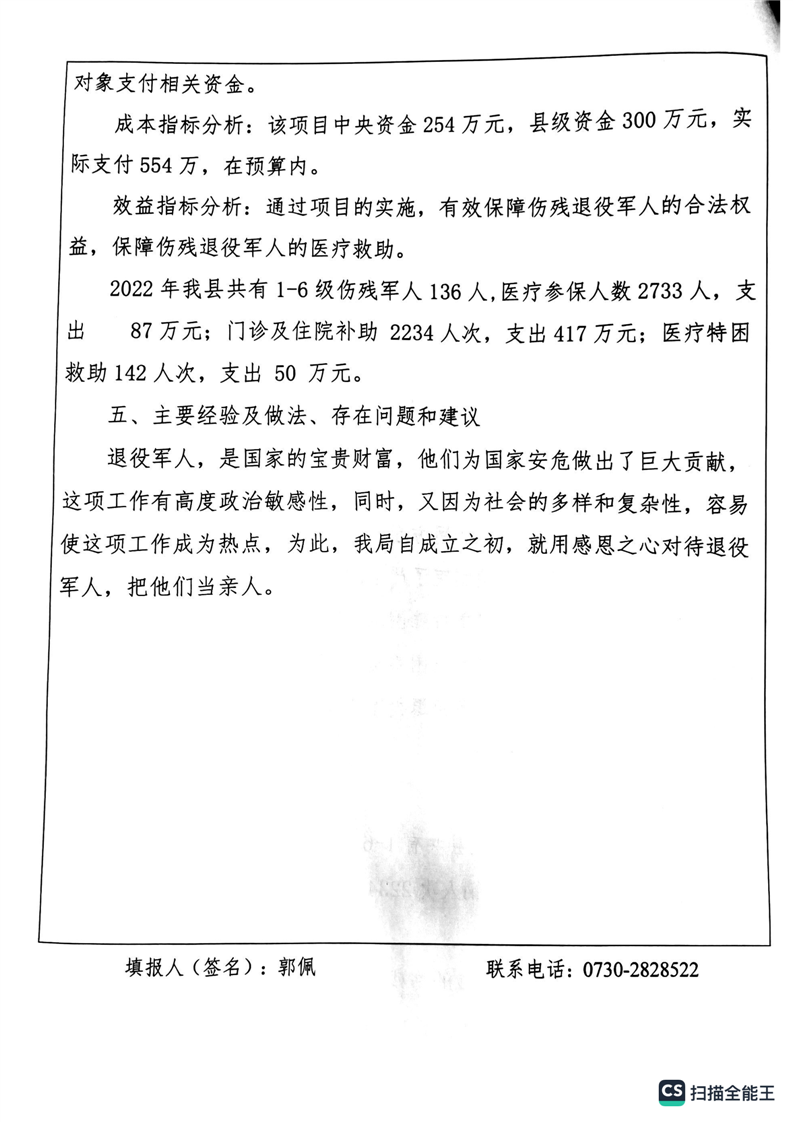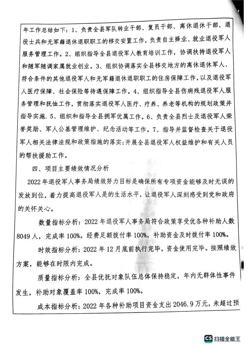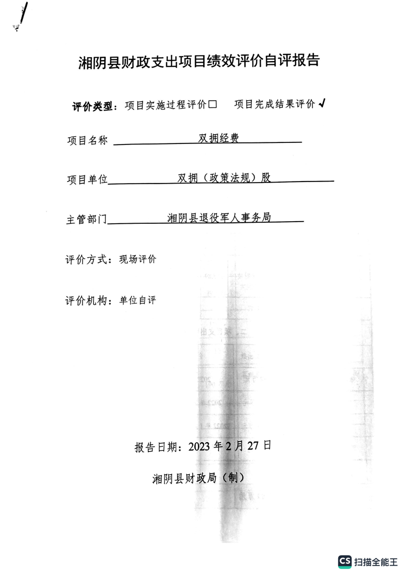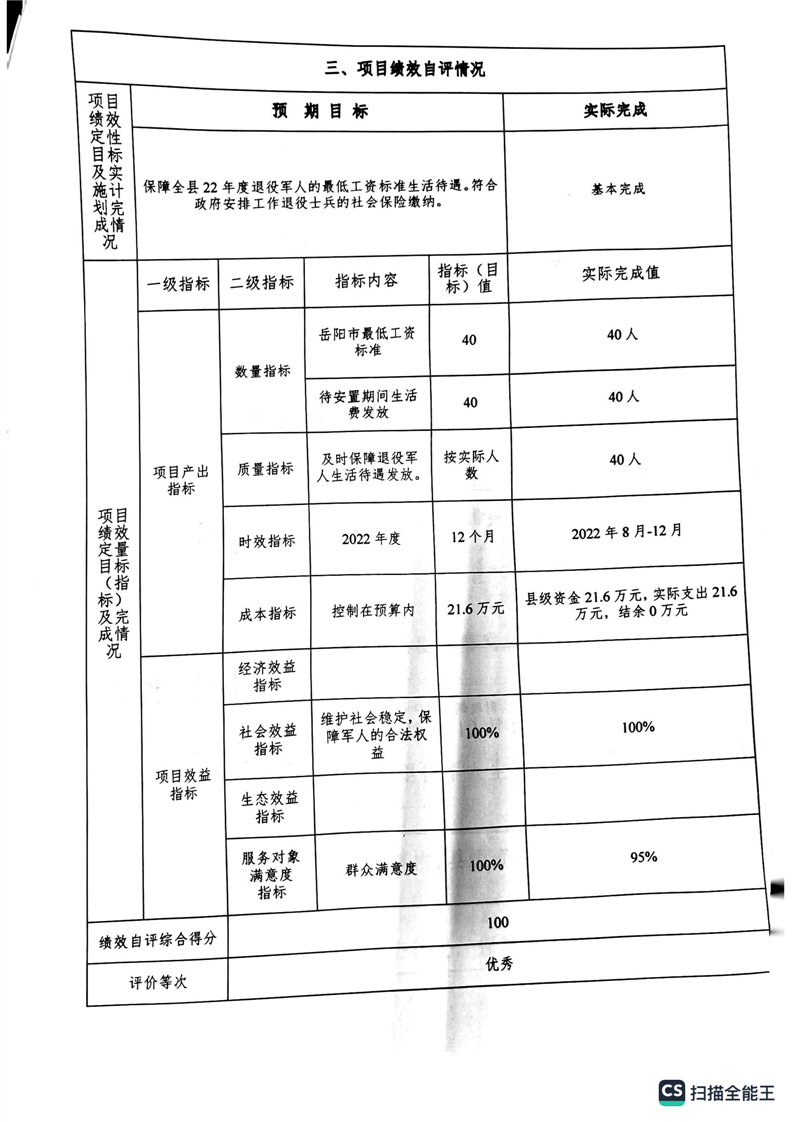 湘阴县退役军人事务局2022年度整体支出绩效自评报告