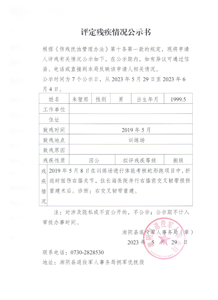 评定残疾情况公示书(欧阳田昊 朱壁熙)