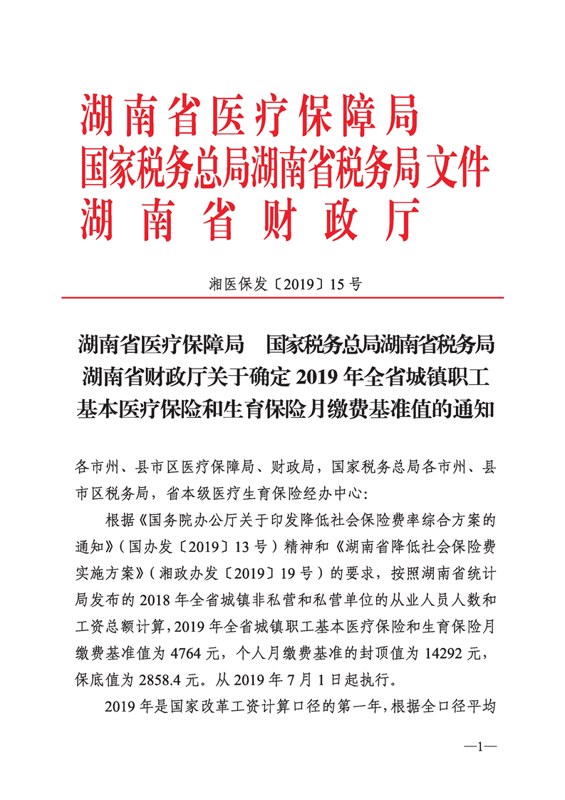 湖南省财政厅关于确定2019年全省城镇职工基本医疗保险和生育保险月缴费基准值得通知