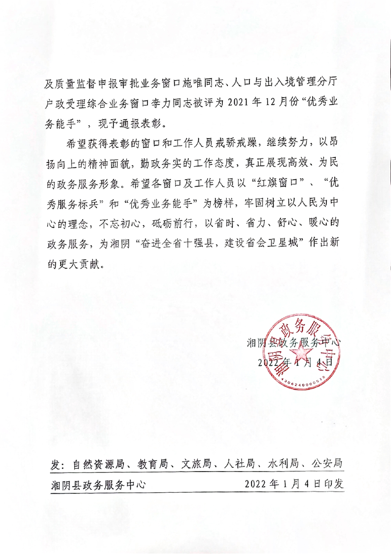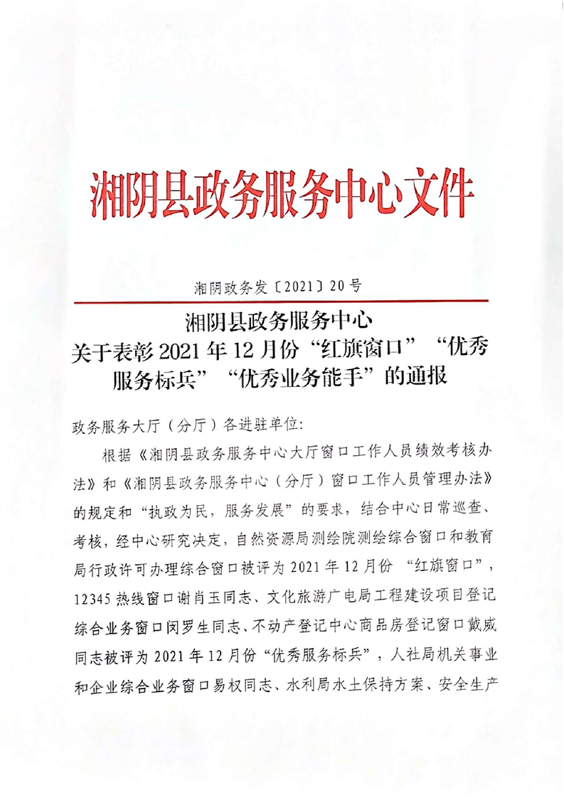 关于表彰2021年12月份“红旗窗口”“优秀服务标兵”“优秀业务能手”的通报