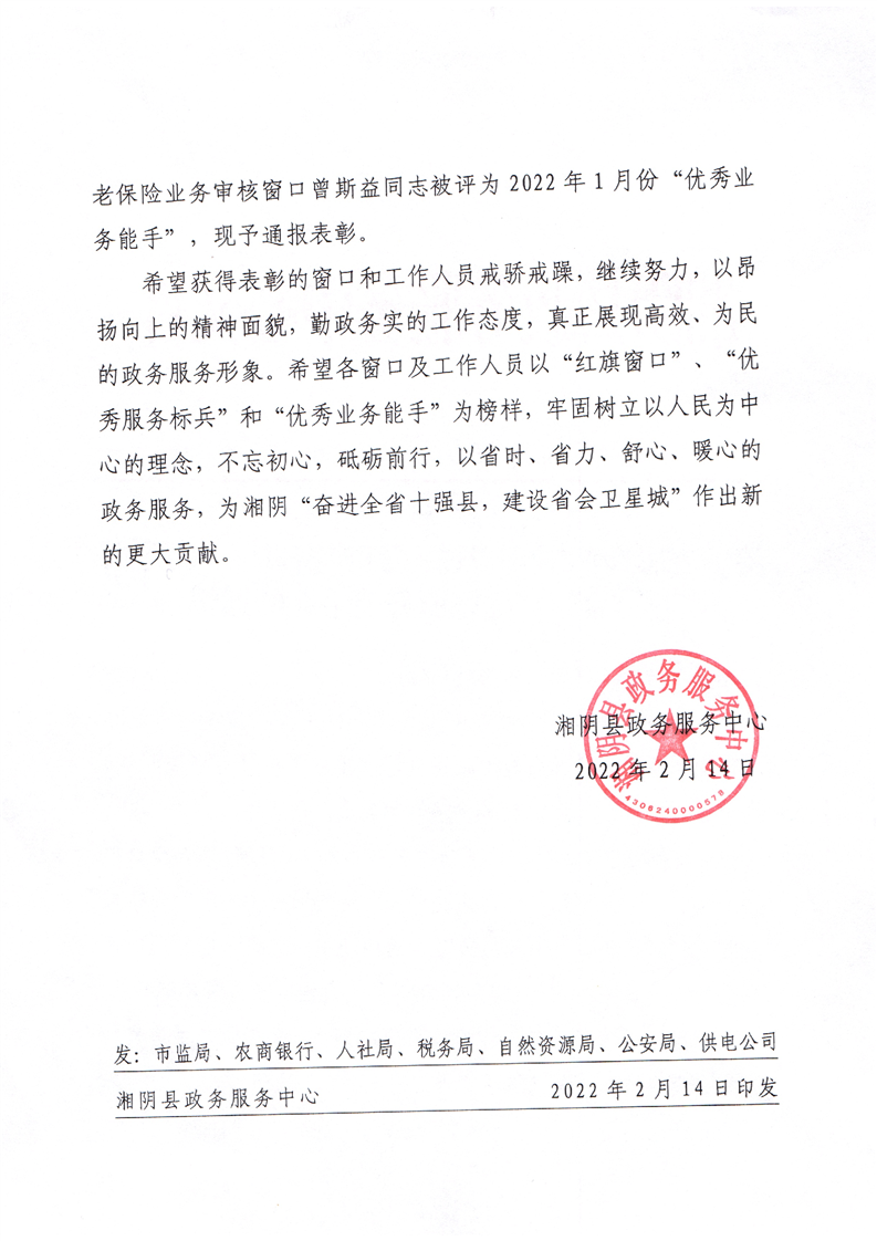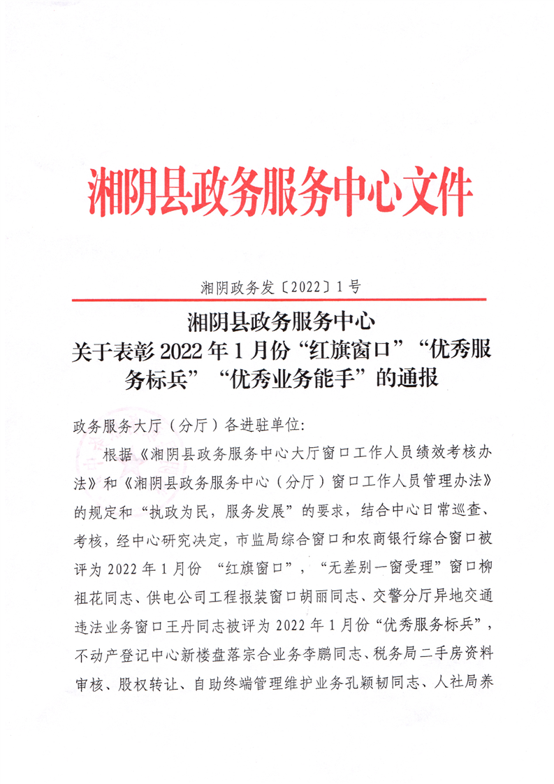 关于表彰2022年1月份“红旗窗口”“优秀服务标兵”“优秀业务能手”的通报