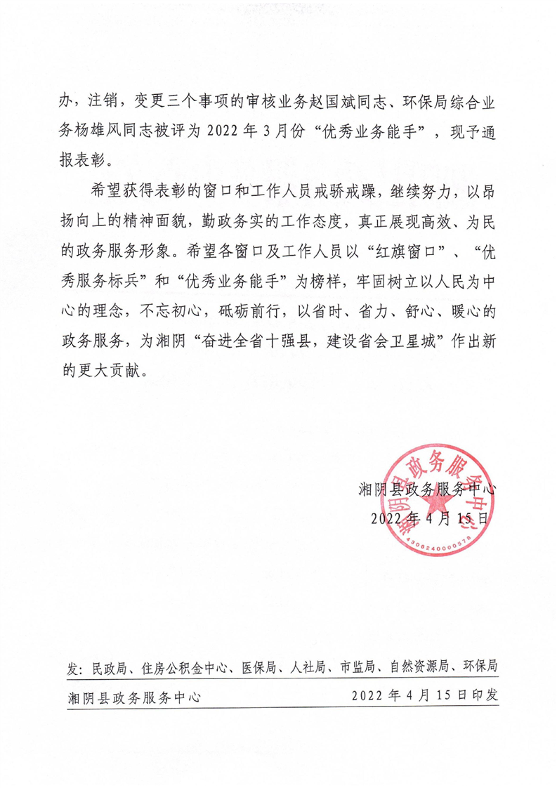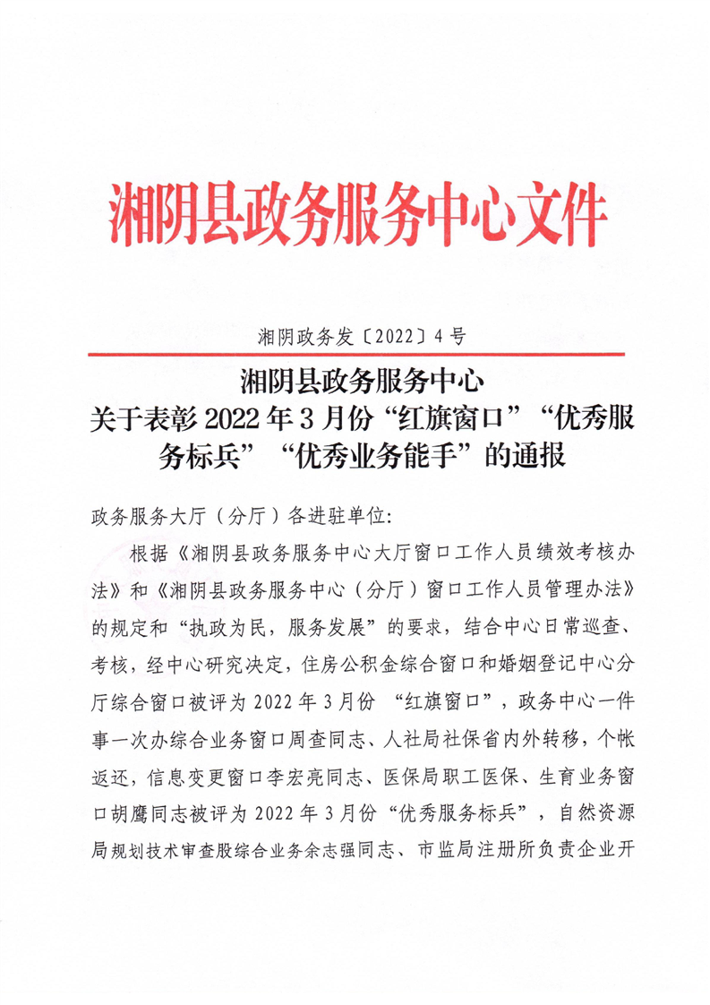 关于表彰2022年3月份“红旗窗口”“优秀服务标兵”“优秀业务能手”的通报