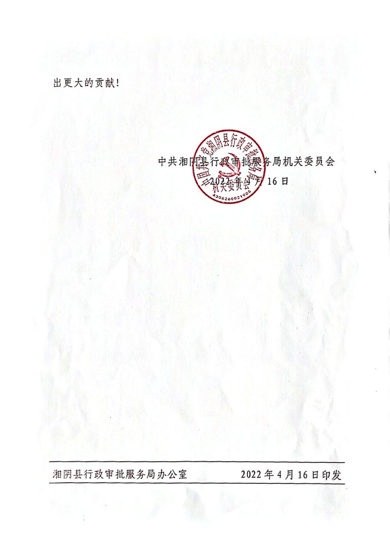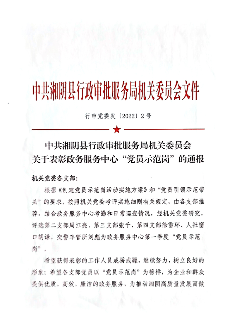 中共湘阴县行政审批服务局机关委员会 关于表彰政务服务中心“党员示范岗”的通报