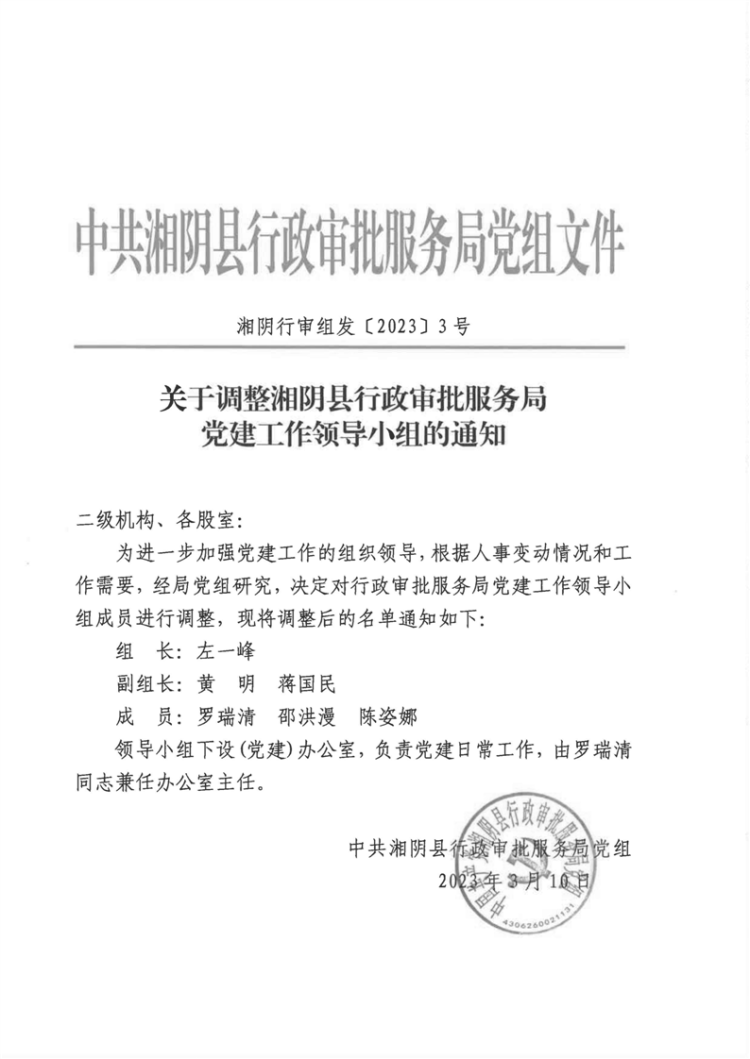 关于调整湘阴县行政审批服务局党建工作领导小组的通知