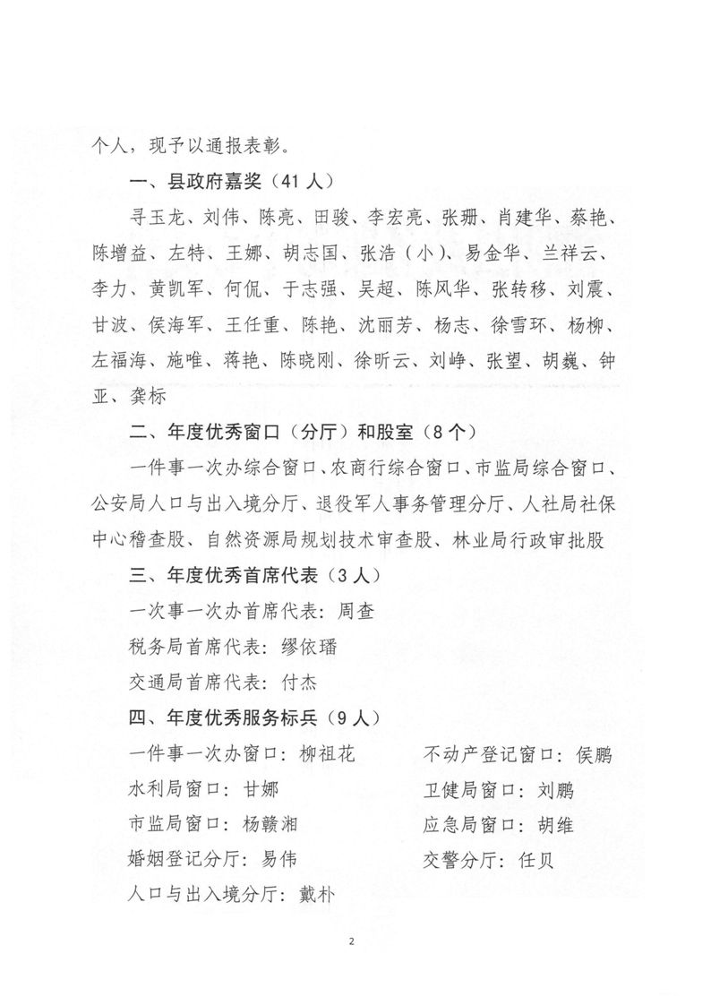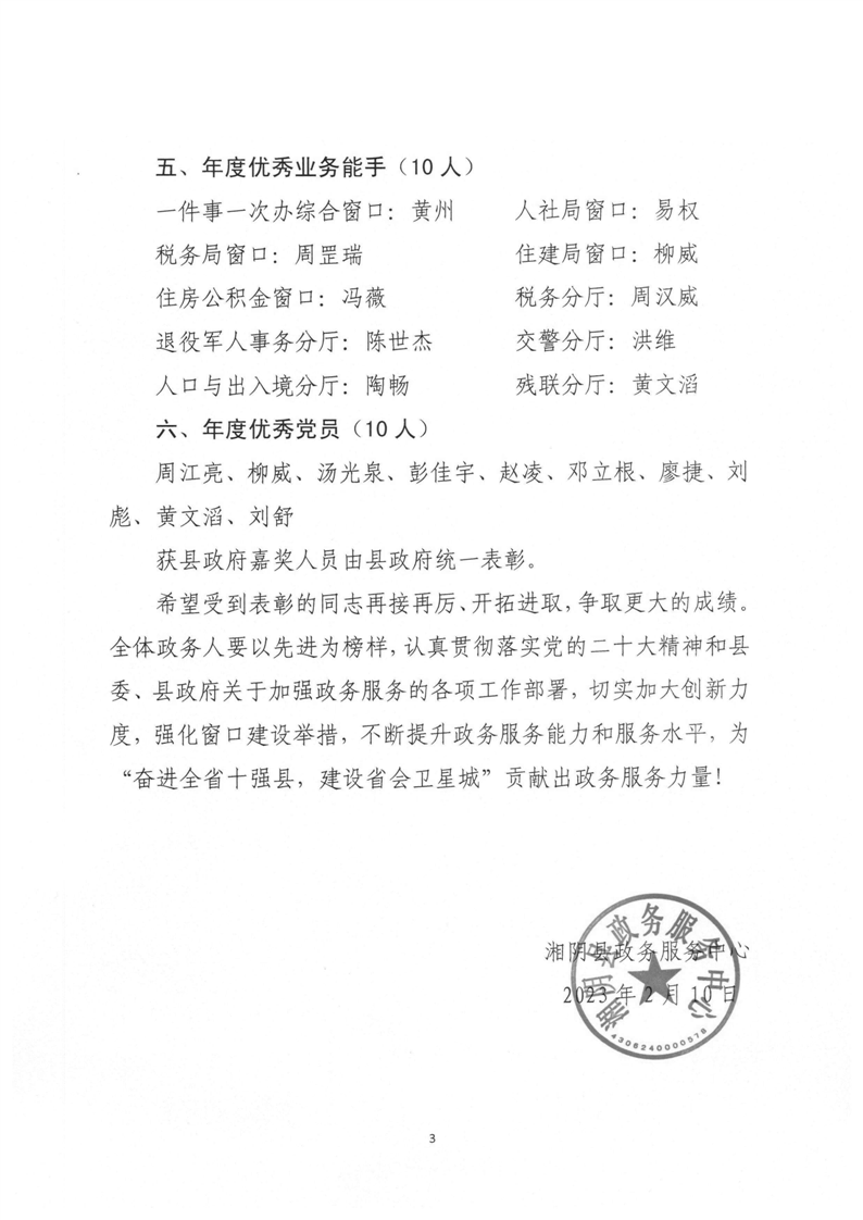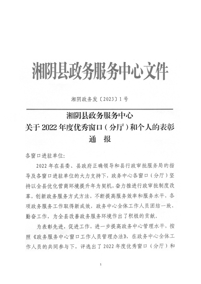 湘阴政务发〔2023〕1号2022年度优秀窗口(分厅)和个人的表彰通报