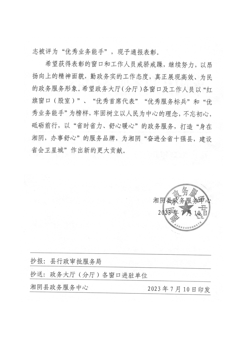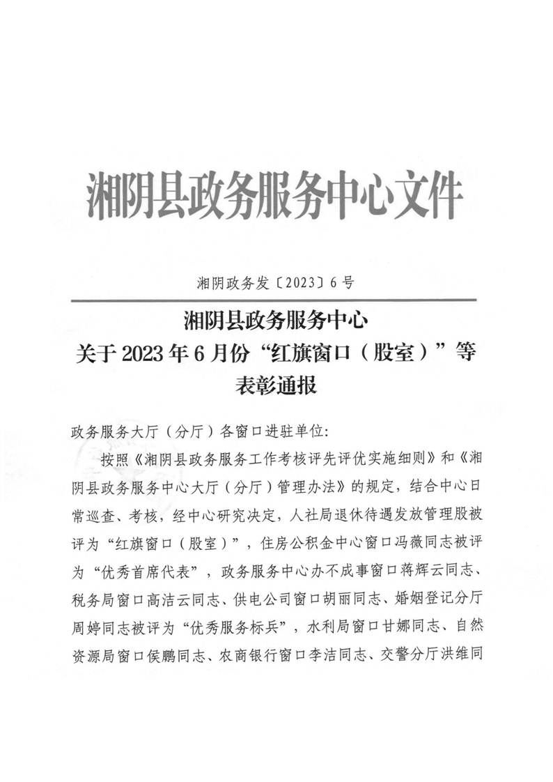 湘阴政务发〔2023〕6号2023年6月份表彰通报
