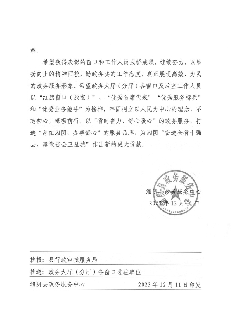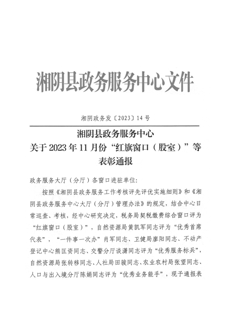 湘阴政务发〔2023〕14号2023年11月份表彰通报