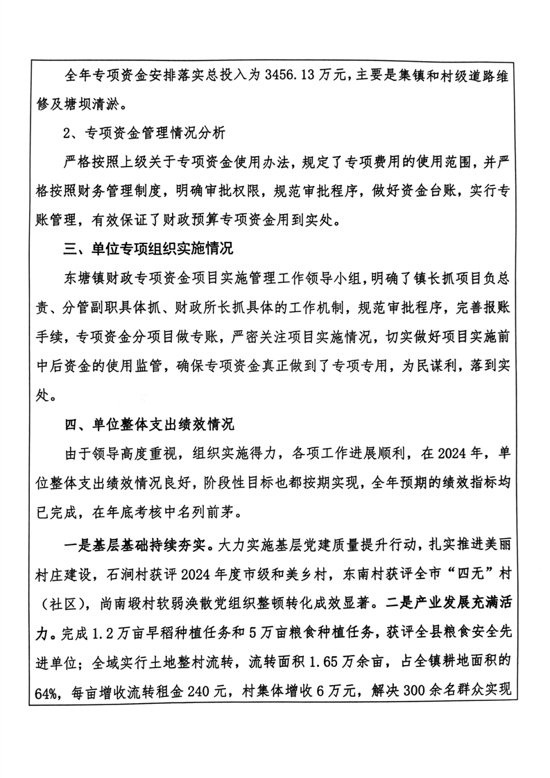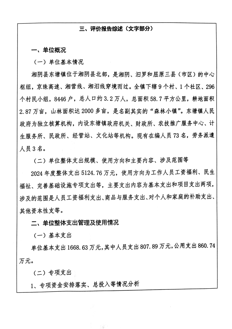 湘阴县东塘镇人民政府2024年度整体支出绩效评价自评报告