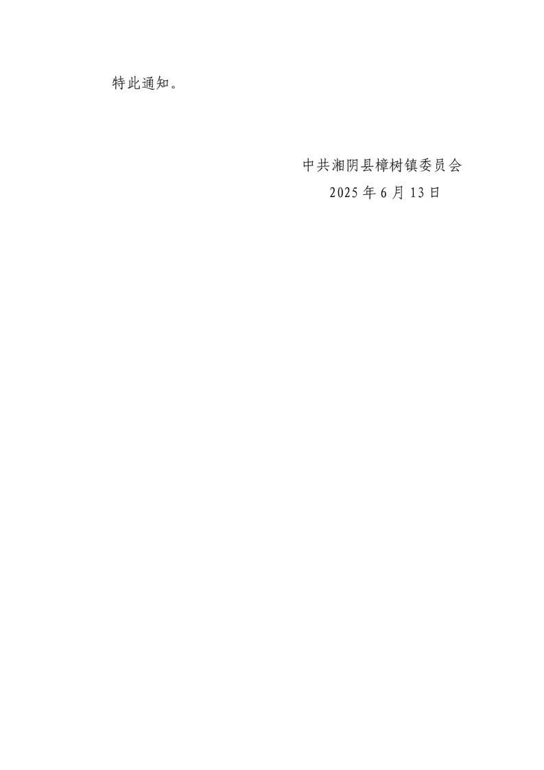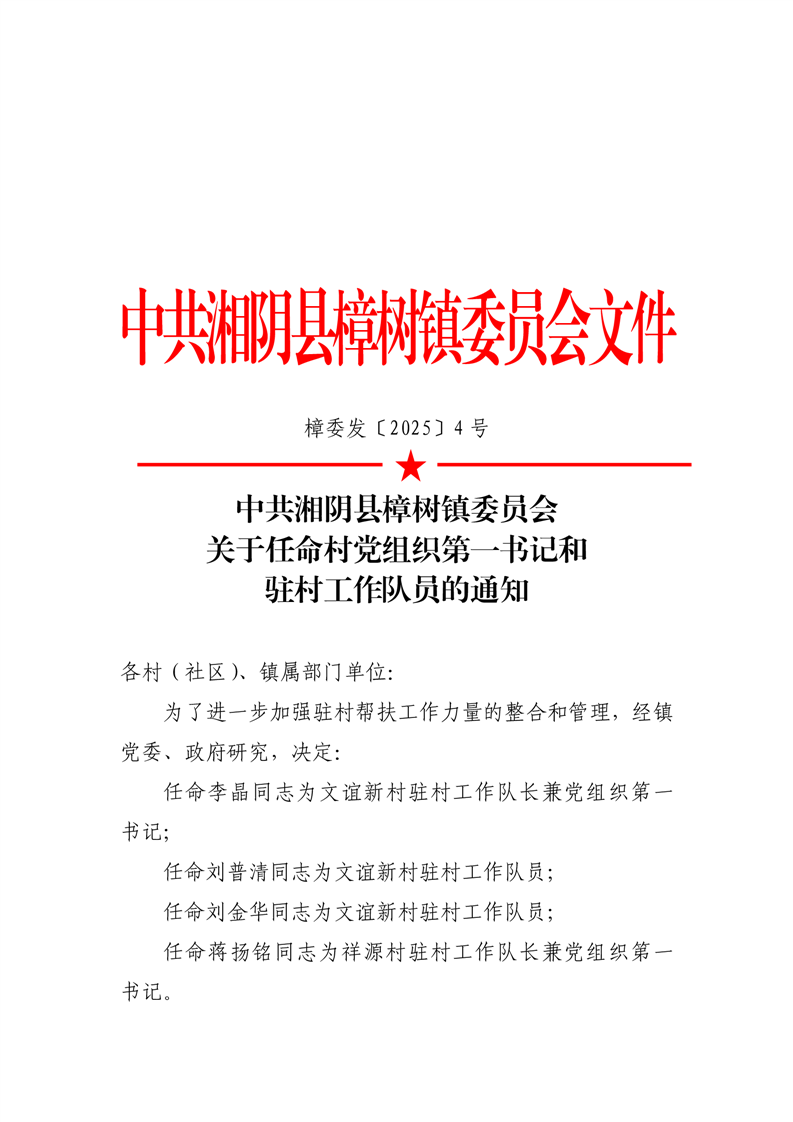 中共湘阴县樟树镇委员会关于任命村党组织第一书记和驻村工作队员的通知