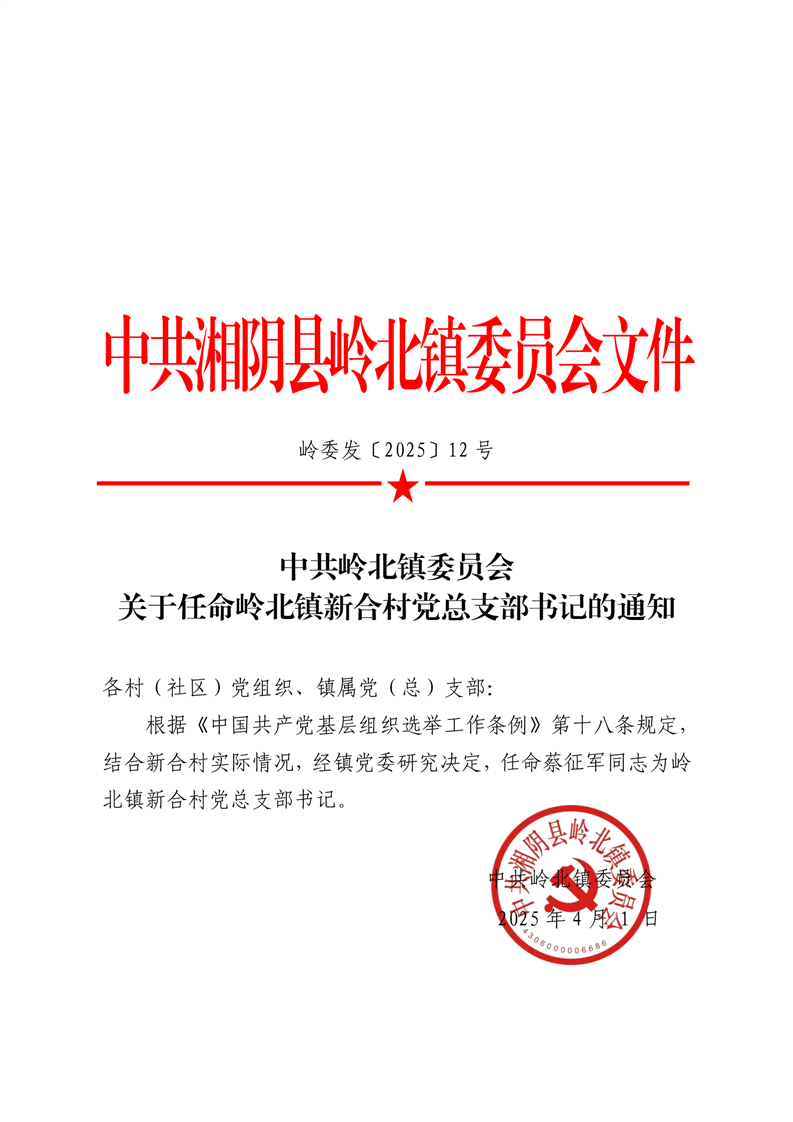 岭委发〔2025〕12号 关于任命岭北镇新合村党总支部书记的通知