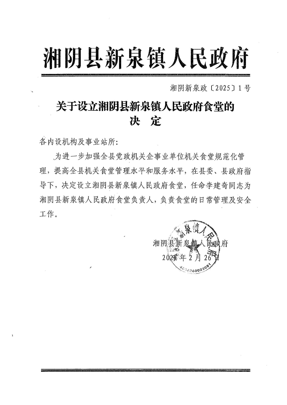 关于设立湘阴县新泉镇人民政府食堂的决定