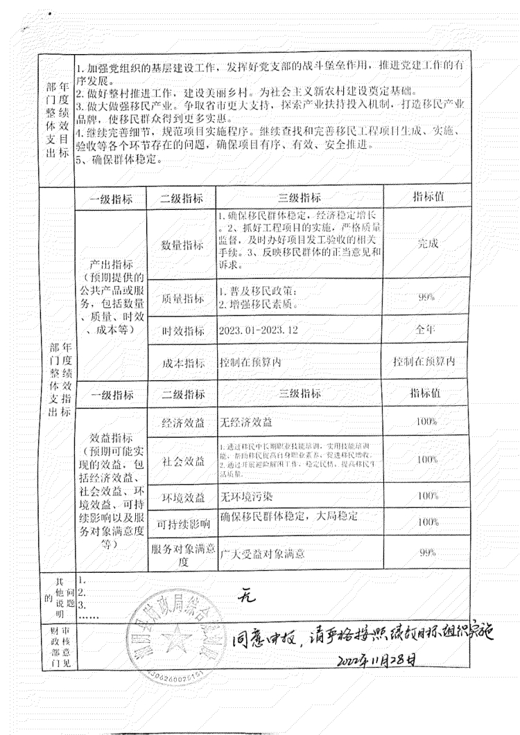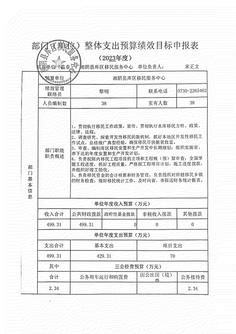 2023年度-湘阴县库区移民服务中心整体支出预算绩效目标申报表