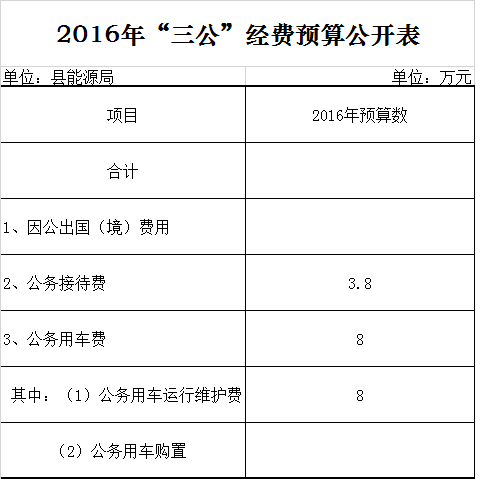 备注:2016年“三公”经费预算数为11.8万元,比上年预算减少8.2万元,降低69.5%。其中,公务接待费3.8万元,比上年减少4.2万元,公务用车运行费8万元,比上年减少4万元。原因是进一步加强公务接待,公务用车管理,规范公务接待,公务用车行为,严控“三公”经费等一般性支出。