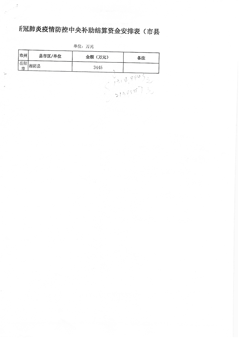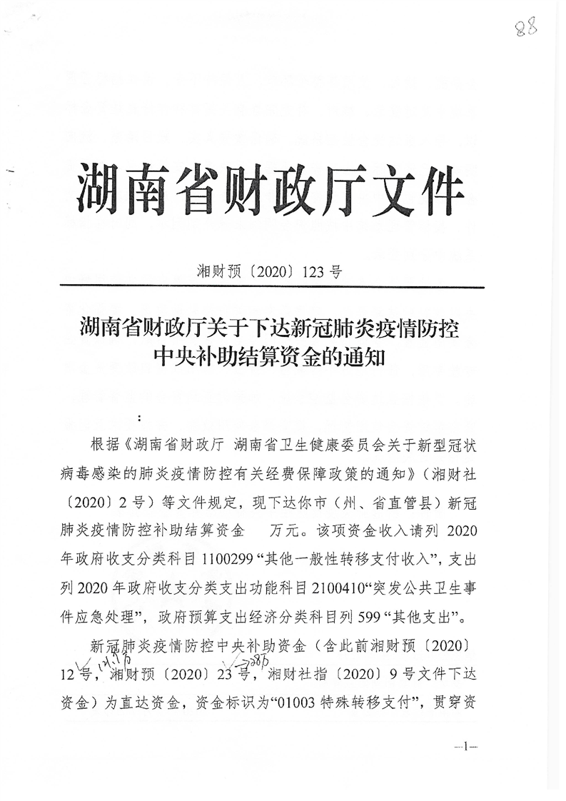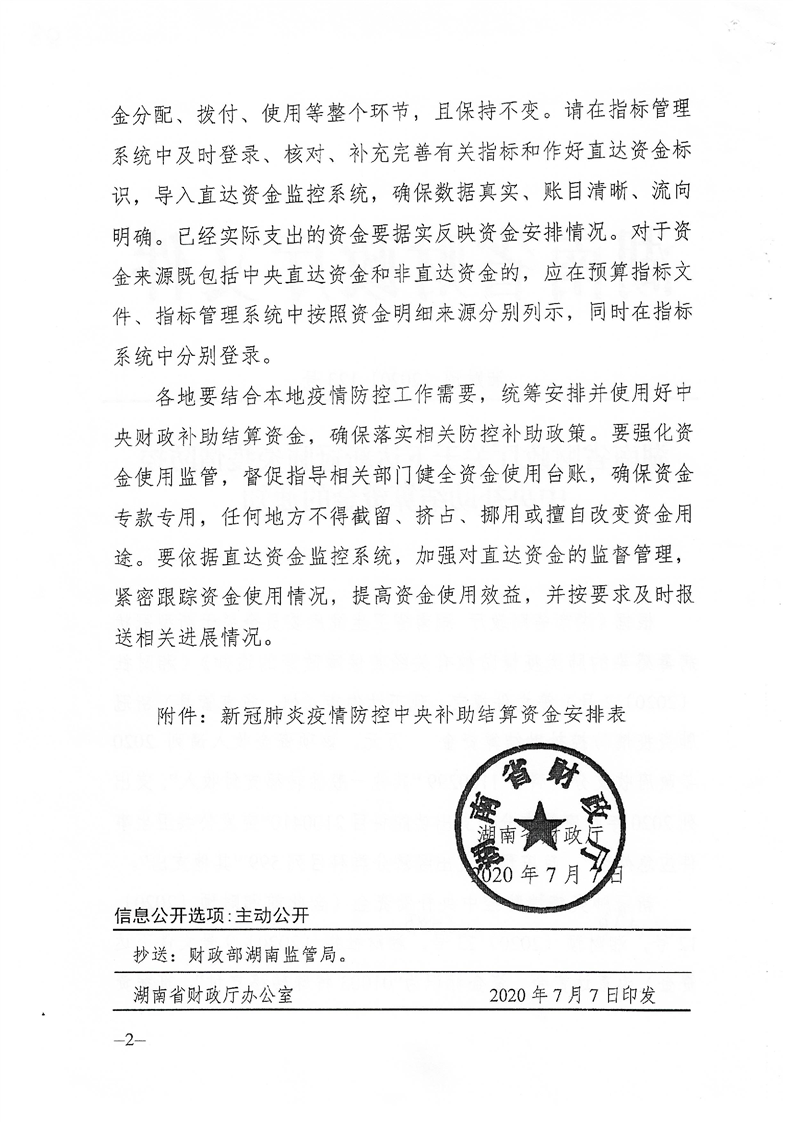 湖南省财政厅关于下达新冠肺炎疫情防控中央补助结算资金的通知