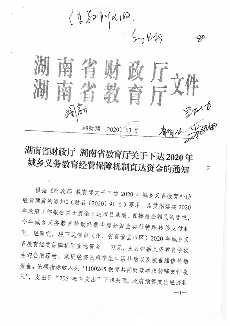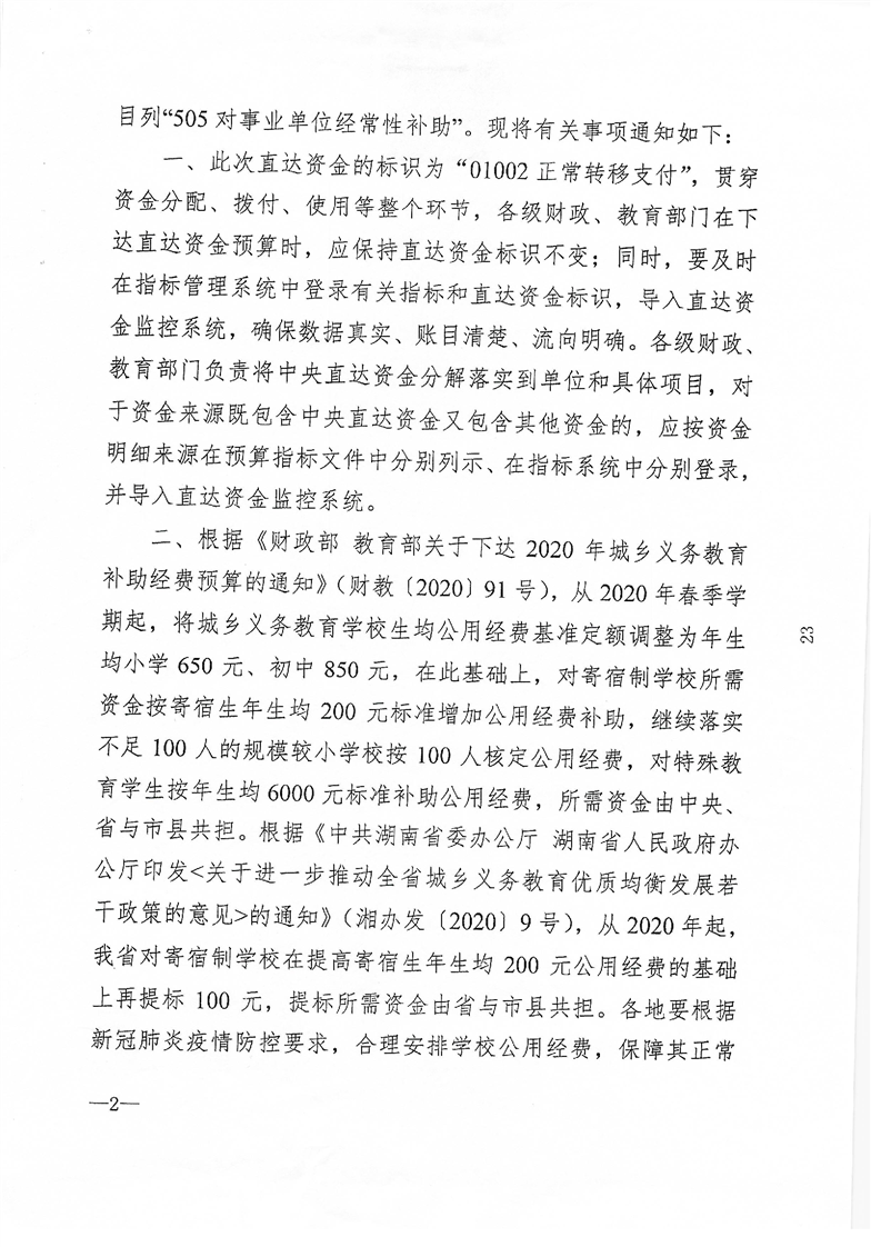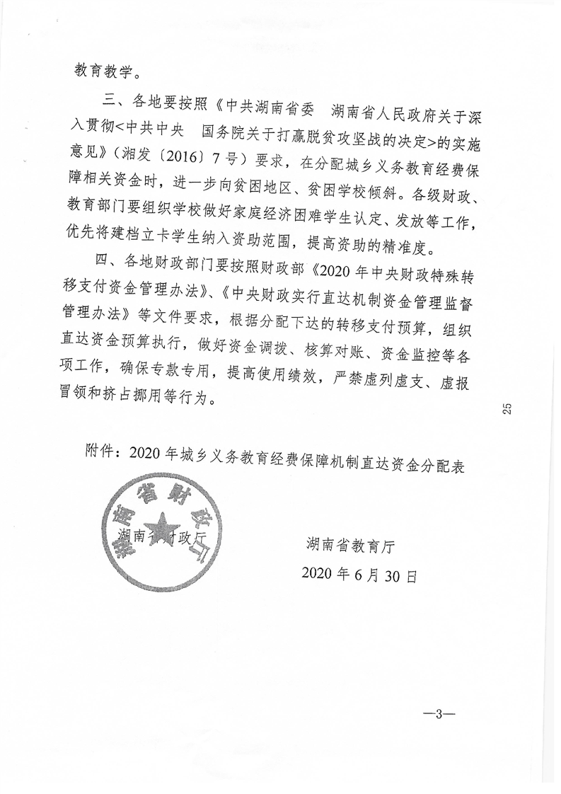 湖南省财政厅湖南省教育厅关于下达2020年城乡义务教育经费保障机制直达资金的通知