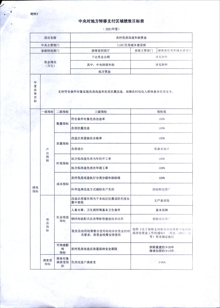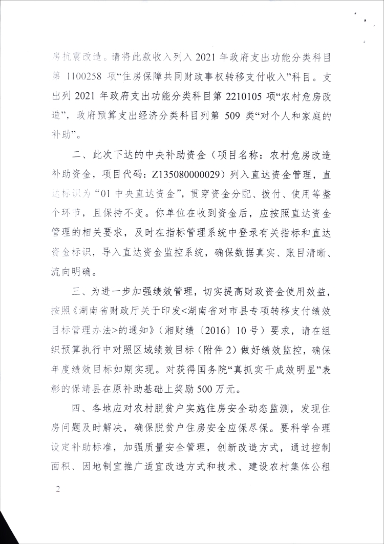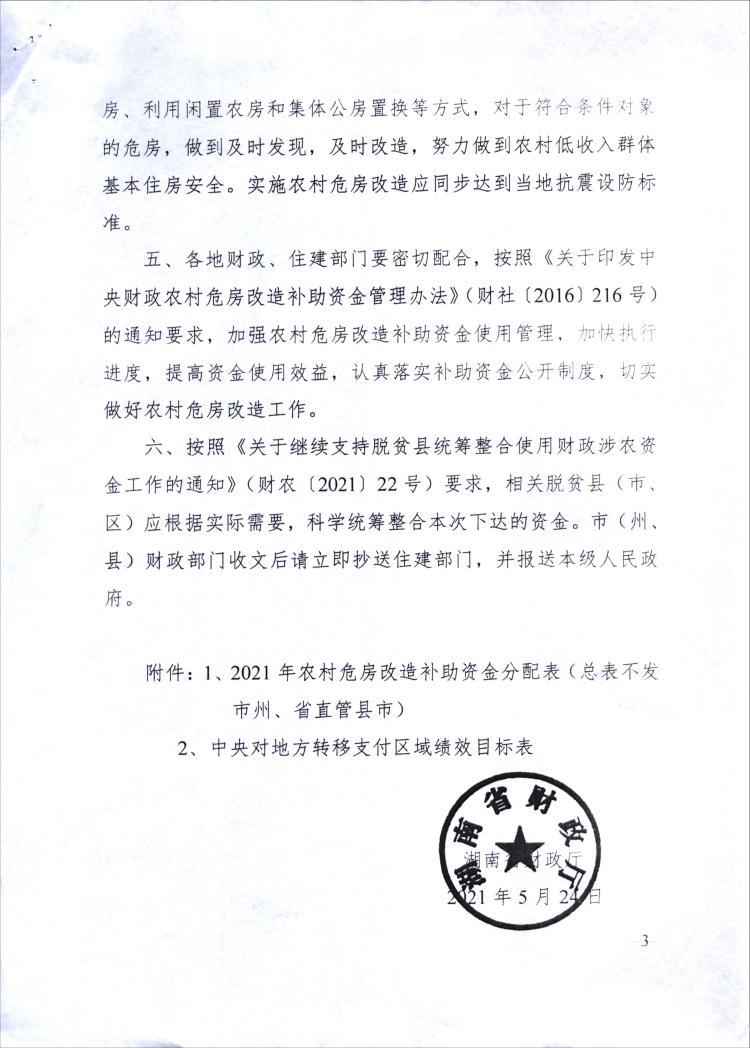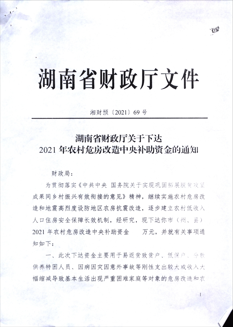湖南省财政厅关于下达2021年农村危房改造中央补助资金的通知